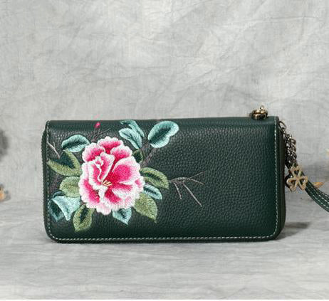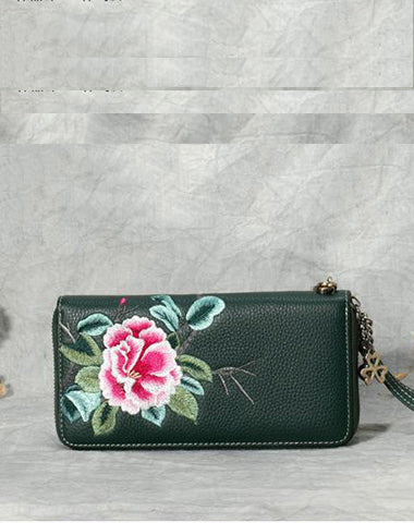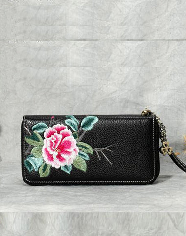 Design: Handmade Embroidery Leather Peony Wristlet Wallet Womens Zip Around Wallets Flowers Peony Ladies Zipper Clutch Wallet for Women