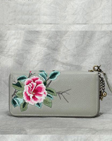 Handmade Embroidery Gray Leather Peony Wristlet Wallet Womens Zip Around Wallets Flowers Peony Ladies Zipper Clutch Wallet for Women