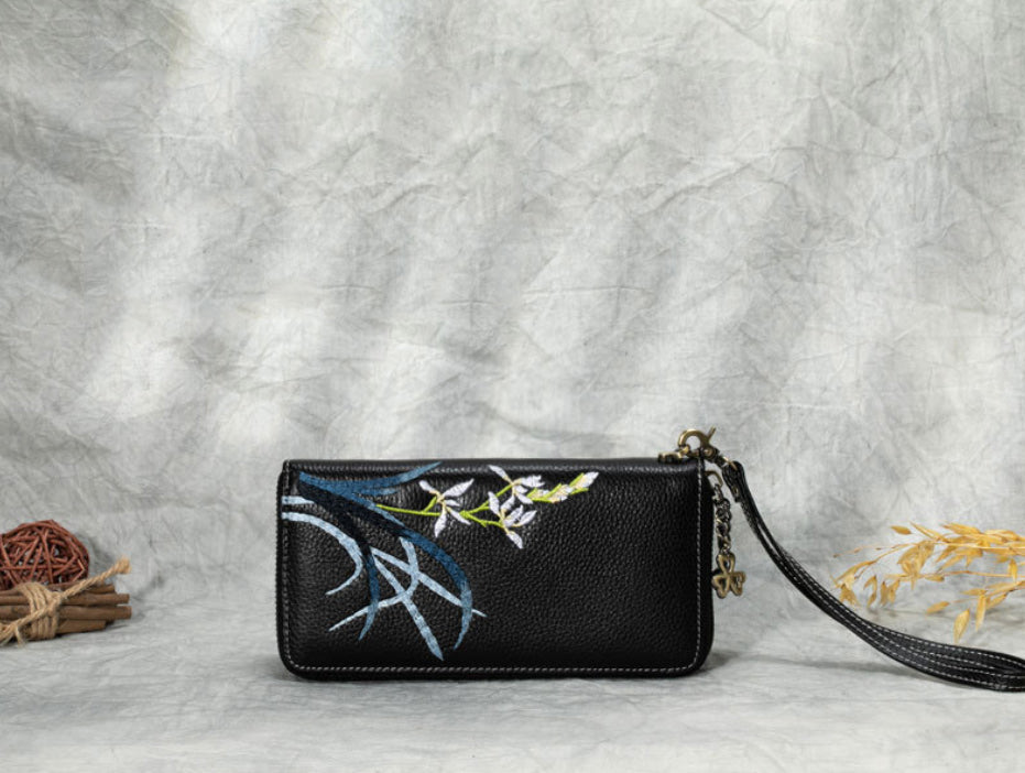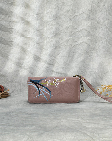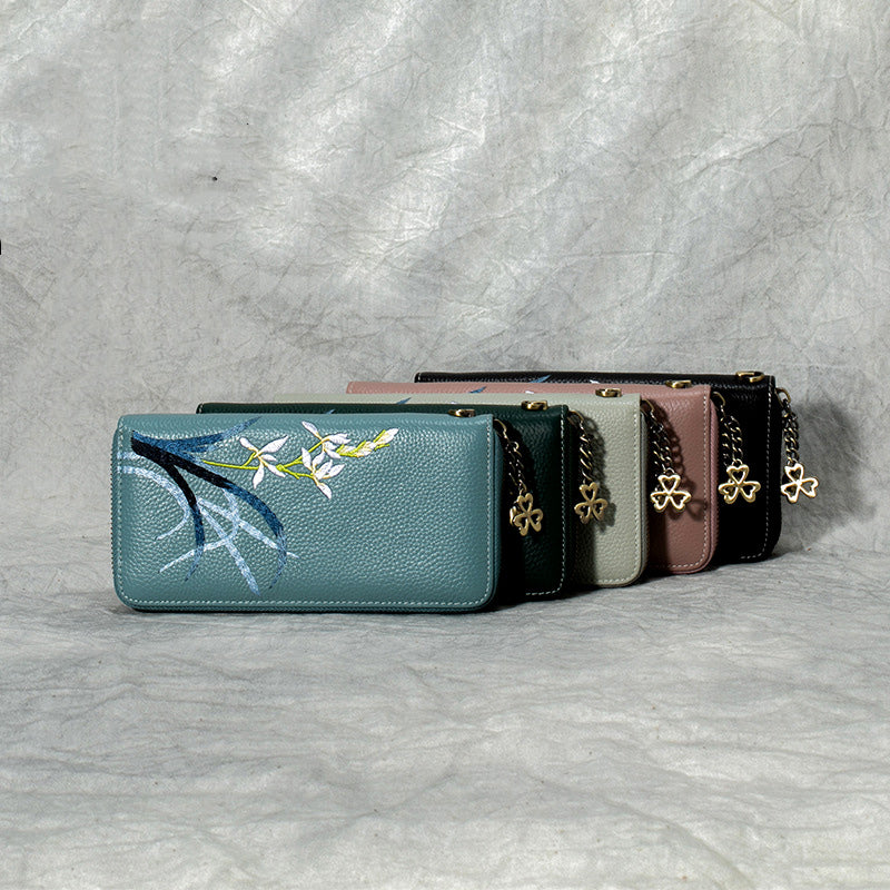 Style: Handmade Embroidery Green Leather Orchids Wristlet Wallet Womens Zip Around Wallets Flowers Orchids Ladies Zipper Clutch Wallet for Women