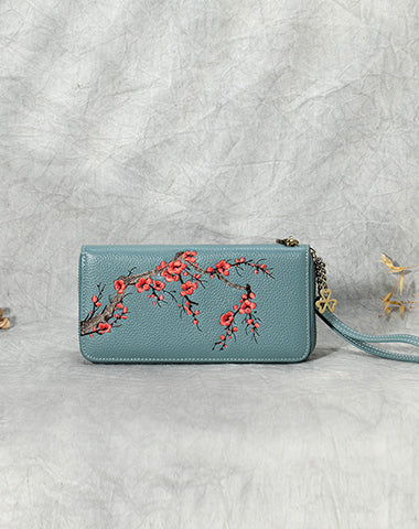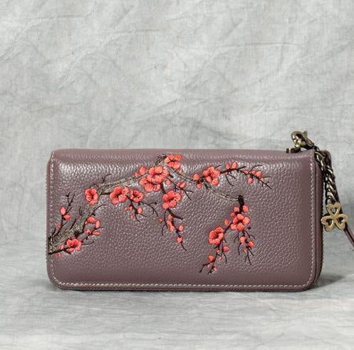 Style:  Handmade Embroidery Leather Wristlet Wallet Womens Zip Around Wallets Flowers Plum Blossom Ladies Zipper Clutch Wallet for Women