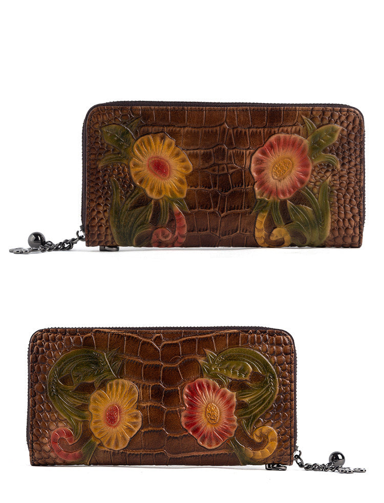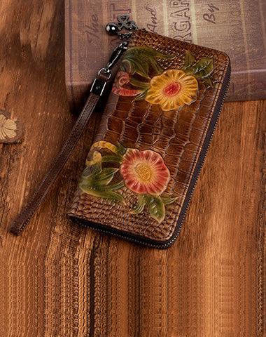 Handmade Floral Coffee Leather Wristlet Wallet Crocodile Pattern Womens Zip Around Wallets Flowers Ladies Zipper Clutch Wallet for Women