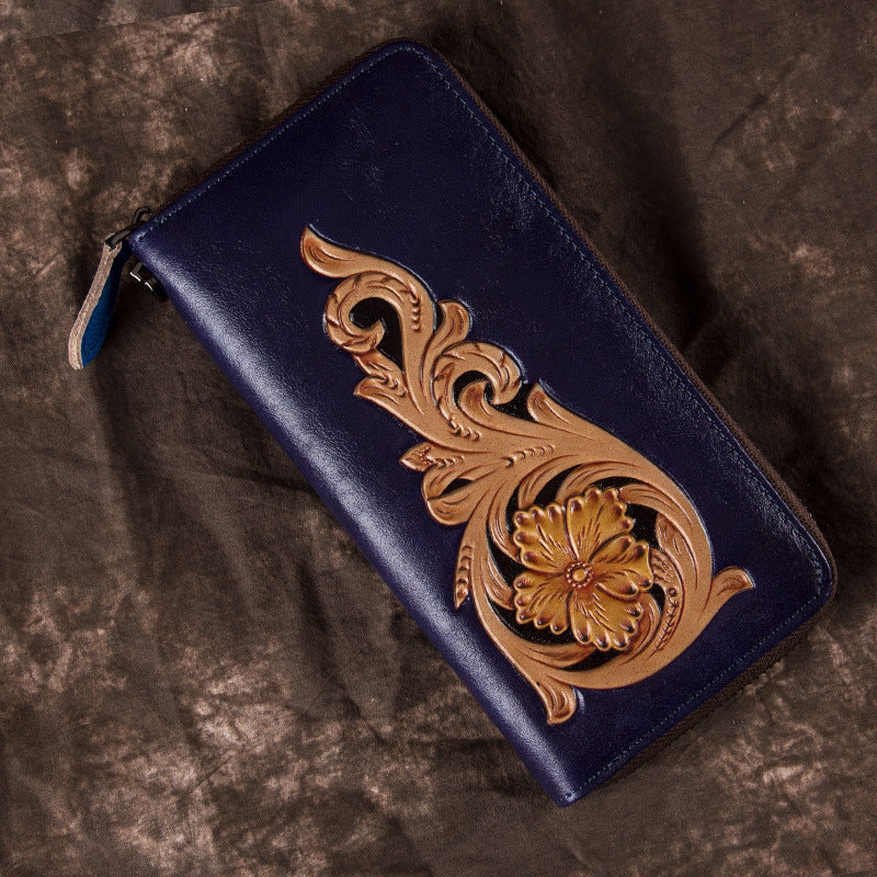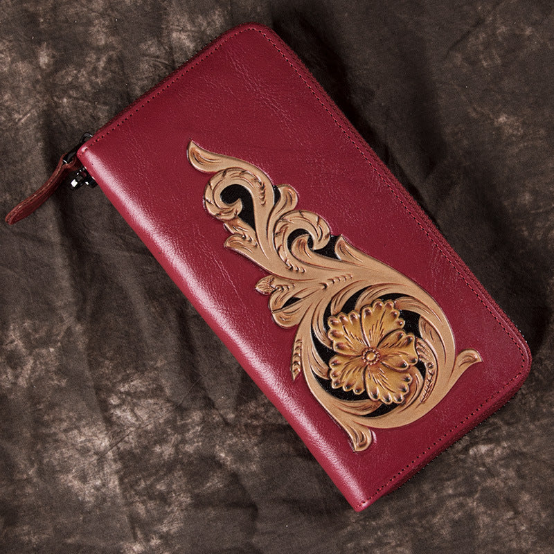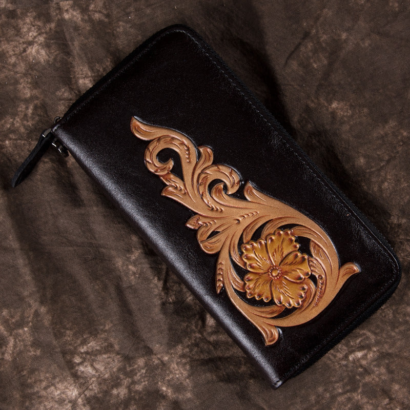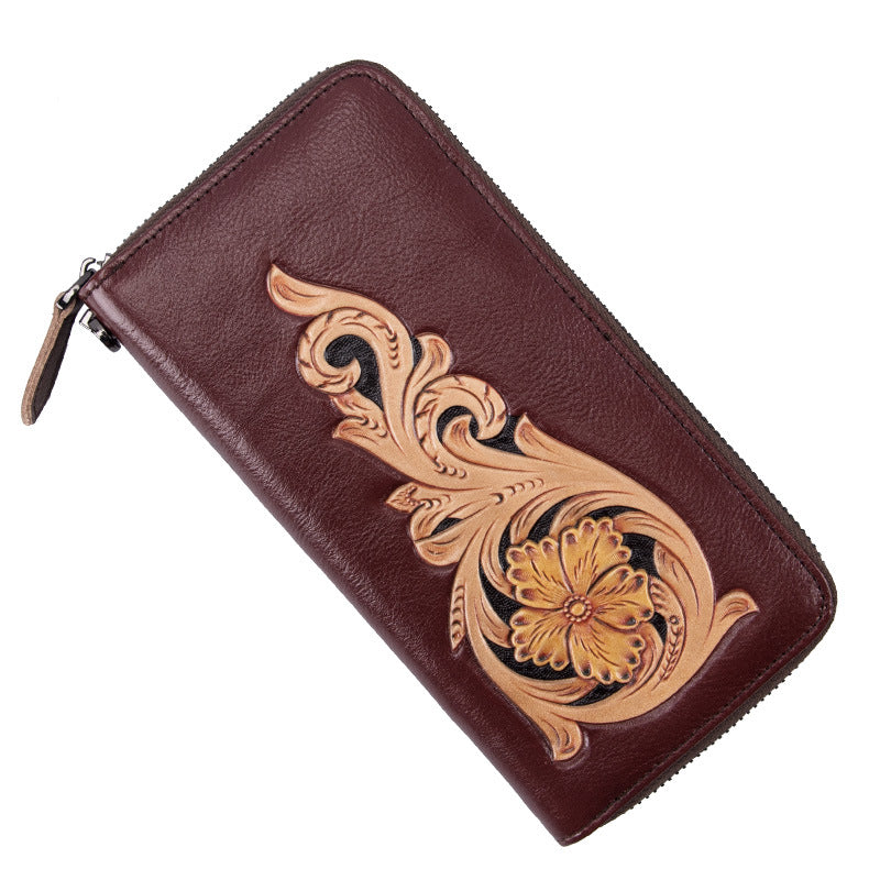 Design: Handmade Floral Coffee Leather Wristlet Wallet Womens Zip Around Wallets Flowers Ladies Zipper Clutch Wallet for Women