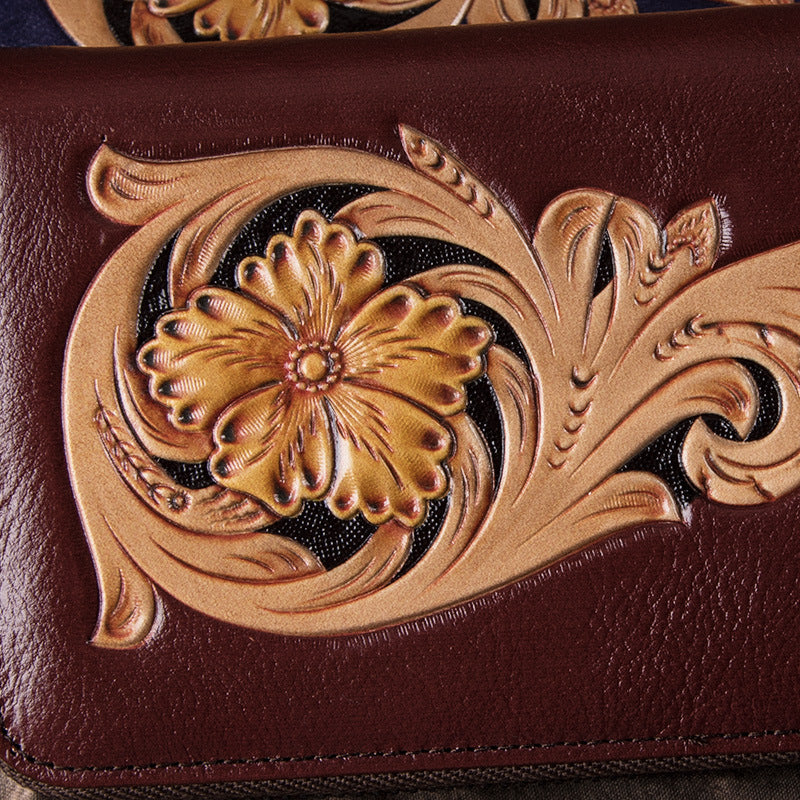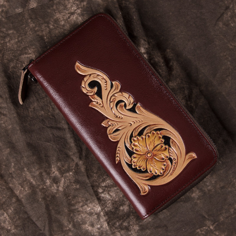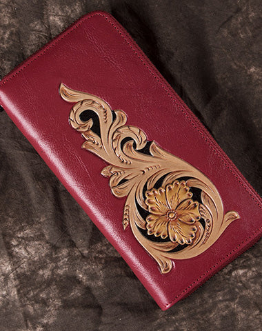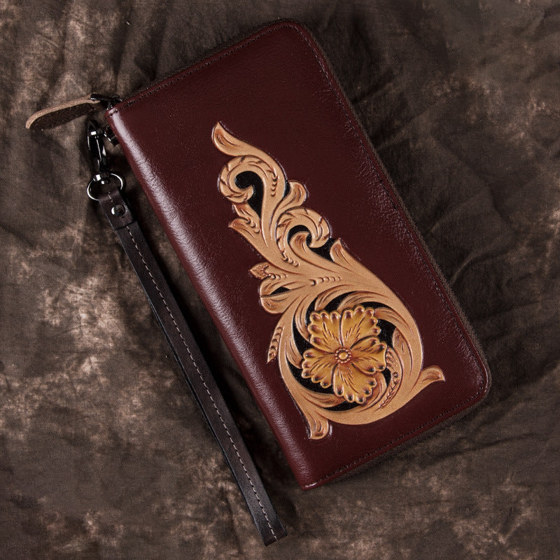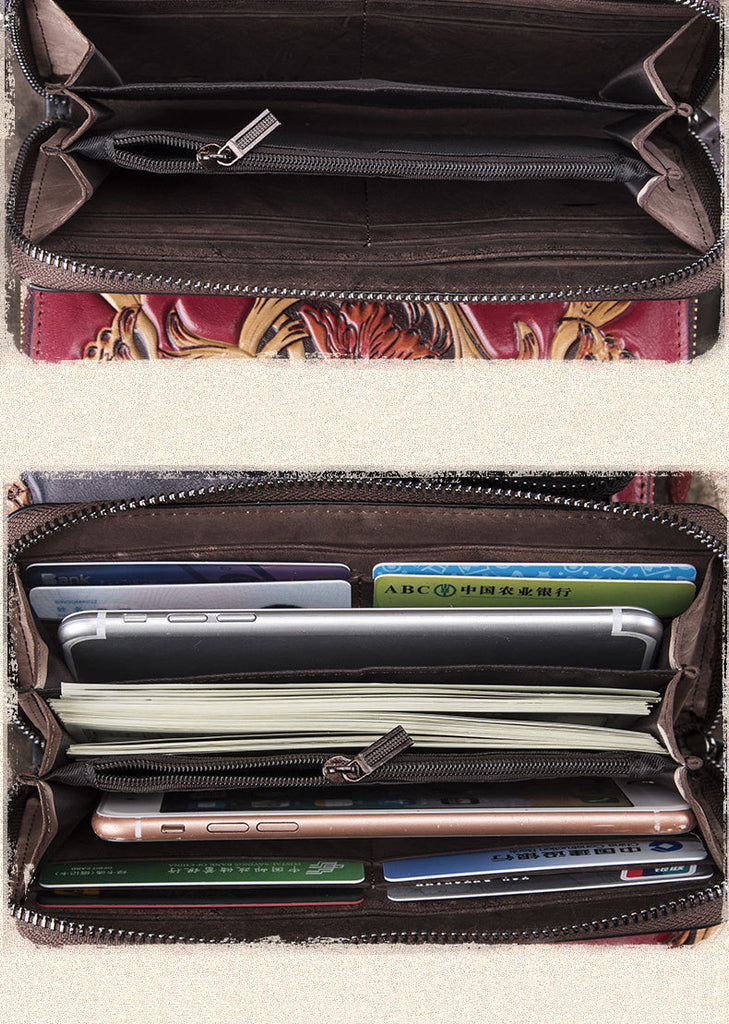 Design: Handmade Floral Red Leather Wristlet Wallet Womens Zip Around Wallets Flowers Ladies Zipper Clutch Wallet for Women