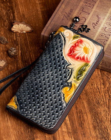 Style: Handmade Leather Wristlet Wallet Womens Floral Zip Around Wallets Flowers Ladies Zipper Clutch Wallet for Women