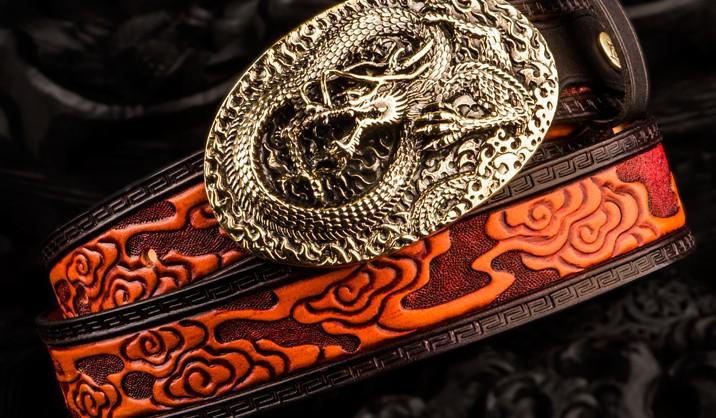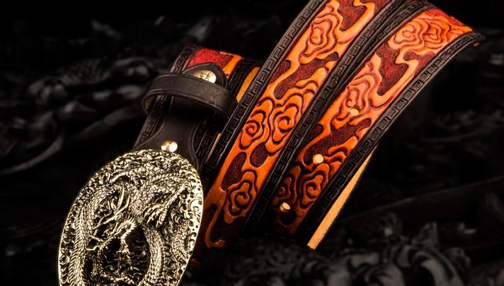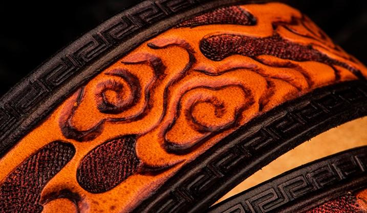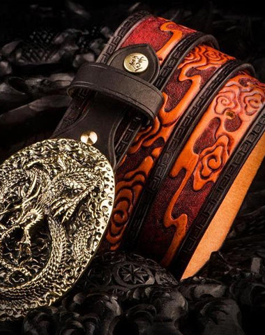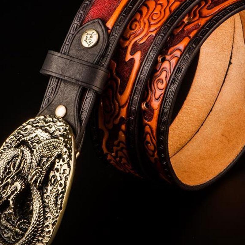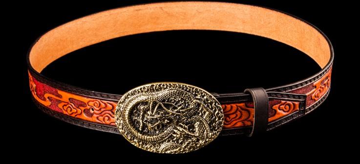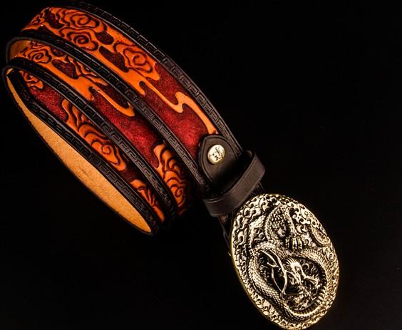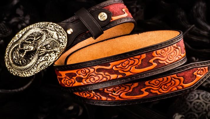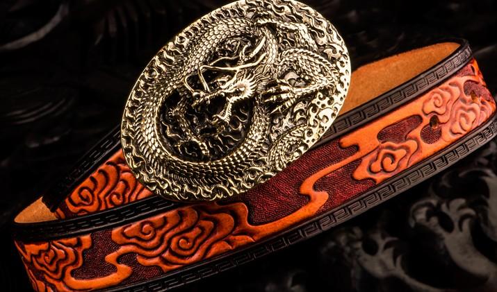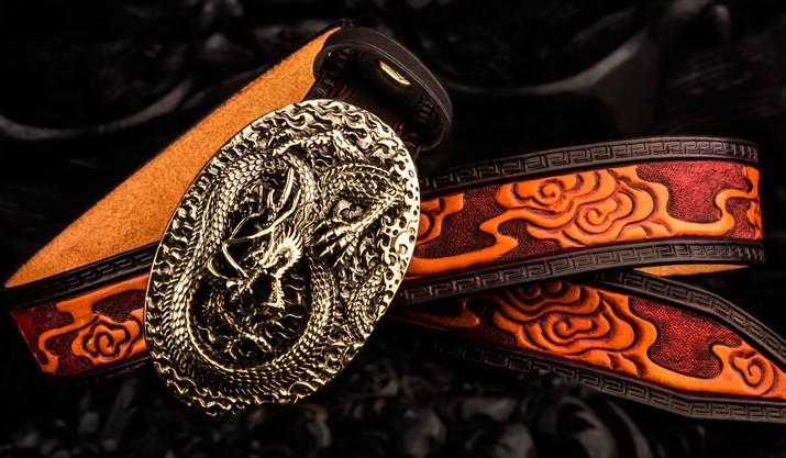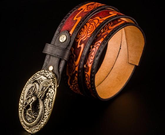 Style: Handmade Genuine Leather Tooled Chinese Dragon Mens Belt Custom Cool Leather Men Belt for Men