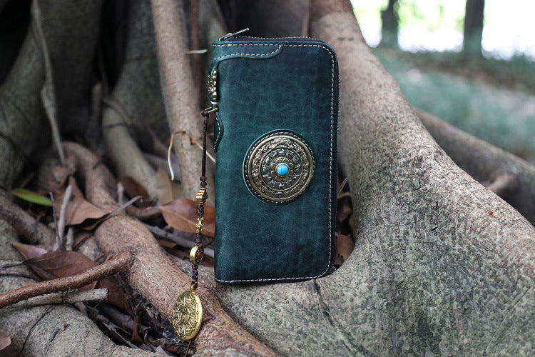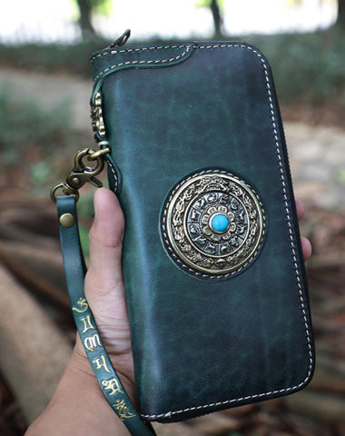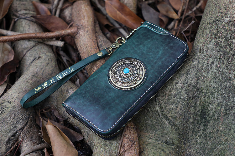 Handmade Green Leather Tibetan Totem Long Wallet Cool Zipper Clutch Wristlet Wallet for Men