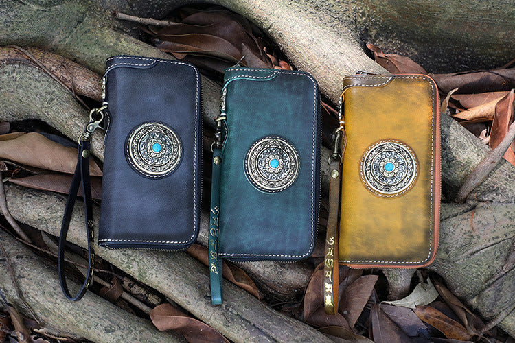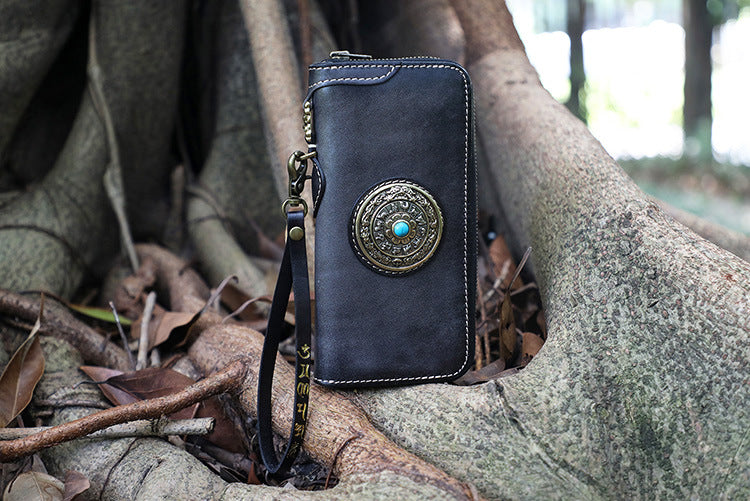Style: Handmade Leather Tibetan Totem Long Wallet Cool Zipper Clutch Wristlet Wallet for Men