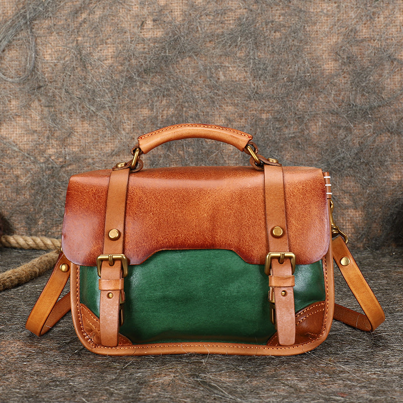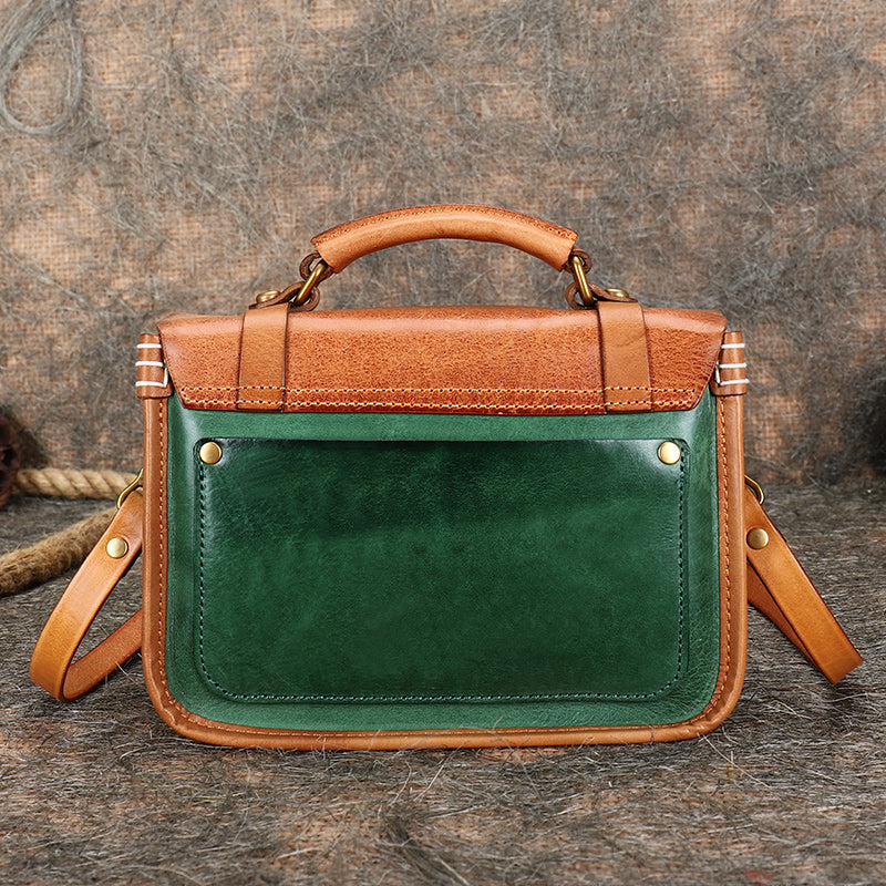 Handmade Green Leather Womens Satchel Shoulder Bag Small School Handbag Crossbody Purses for Ladies