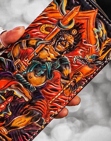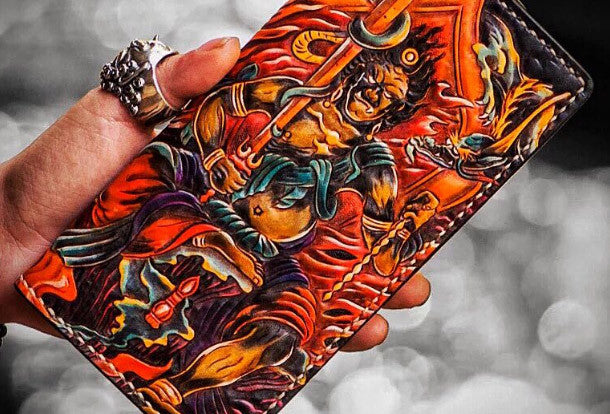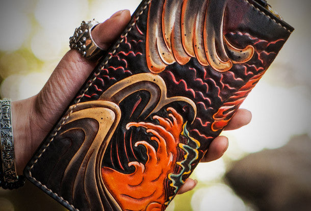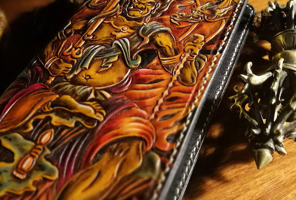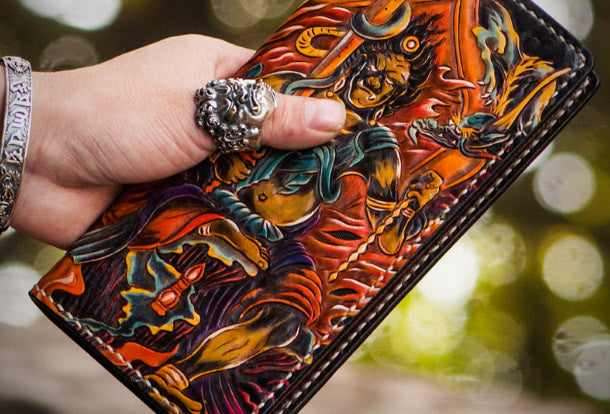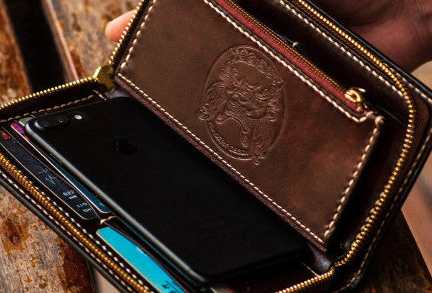 Design: Brown Carved Tooled Acalanatha biker Clutch zip Leather Wallet