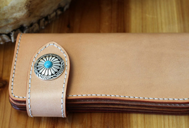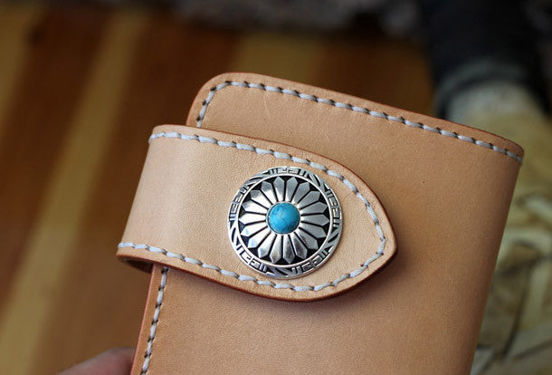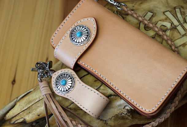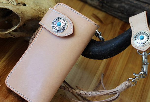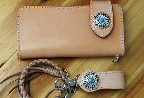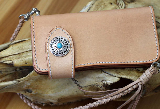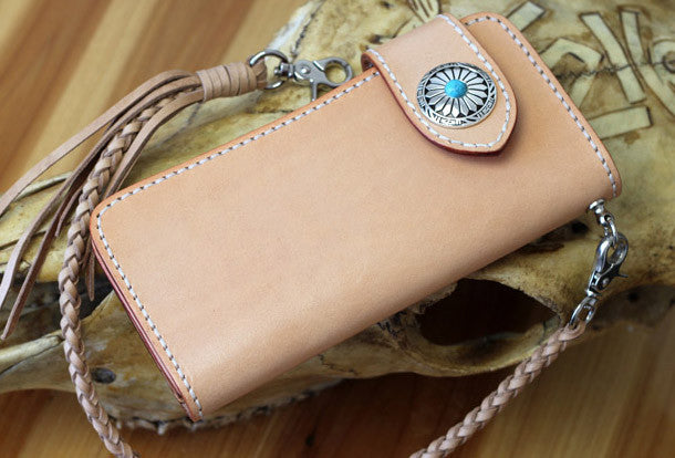 This is handmade beige?natural Italian Vegetable Tanned leather long biker chain wallet purse clutch for men.The wallet is bifold,color is beige?.There are 3?full size bill slots/holders, 10?ID/credit card slots/holders, 1 zip coin slot/holder~Hand-made in the traditional method with punched holes and saddle stitching by hand.