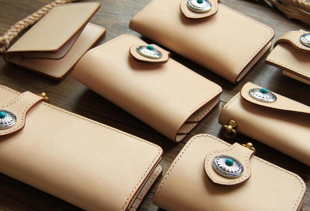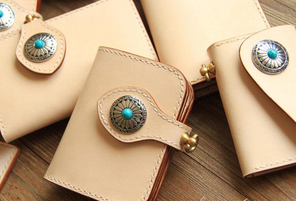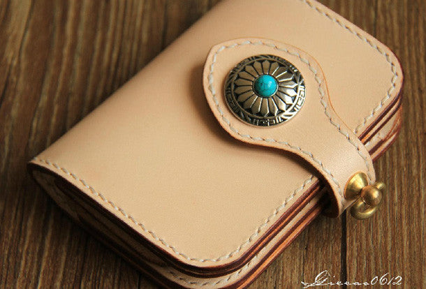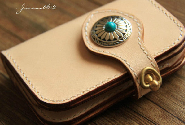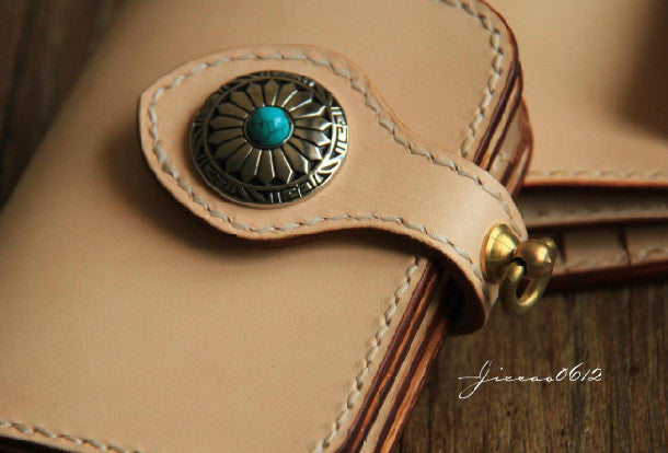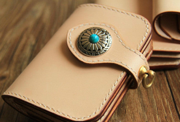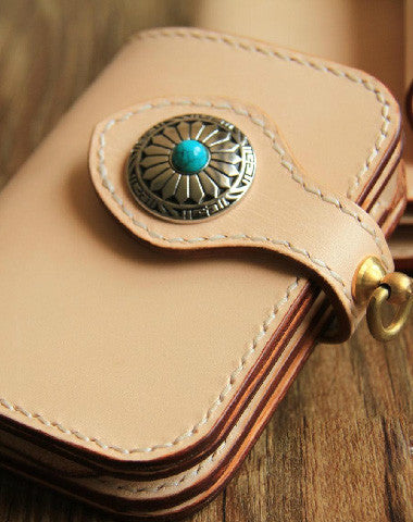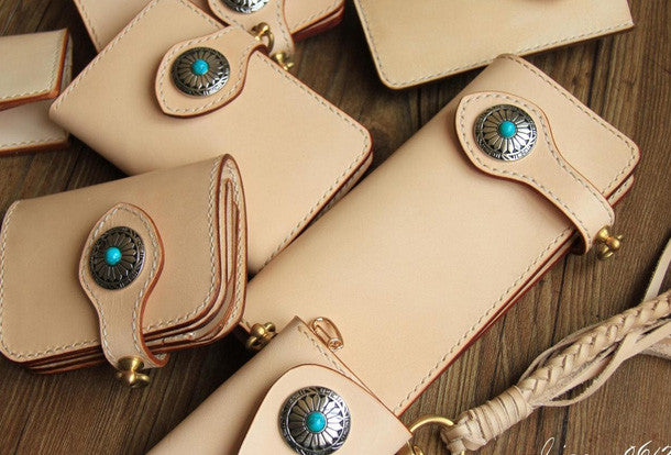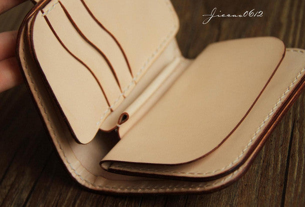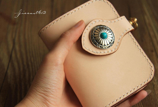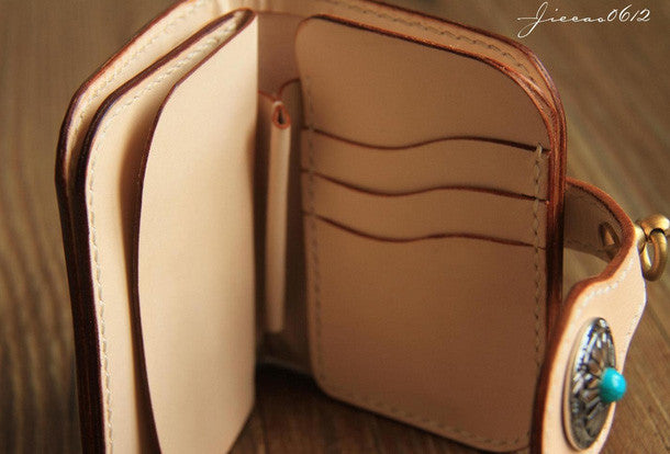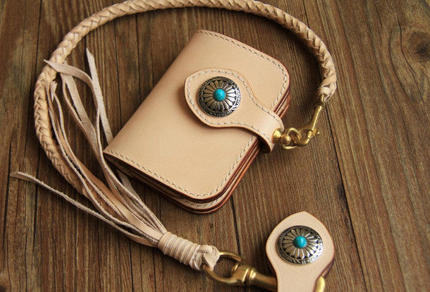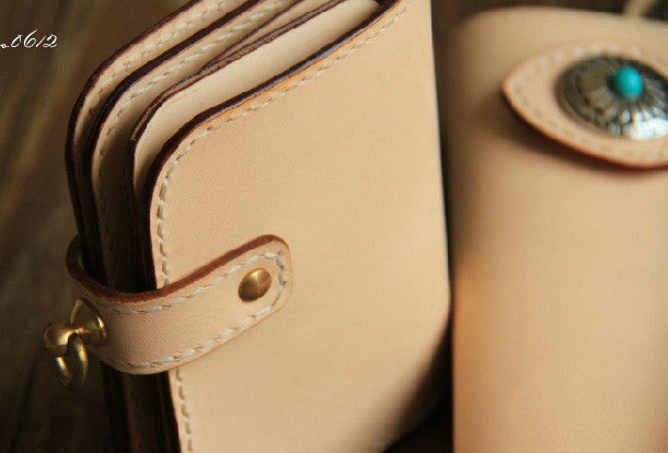This is handmade beige?natural Italian Vegetable Tanned leather?billfold?biker chain wallet purse clutch for men.The wallet is bifold,color is beige.There are 1?full size bill slots/holders, 4?ID/credit card slots/holders, 1 zip coin slot/holder~Hand-made in the traditional method with punched holes and saddle stitching by hand.