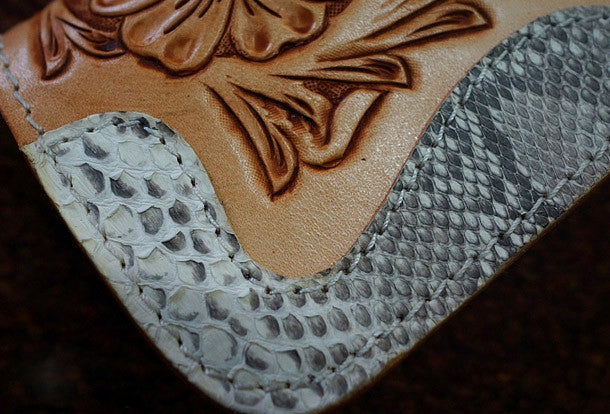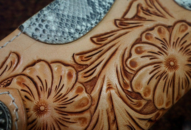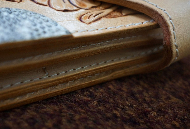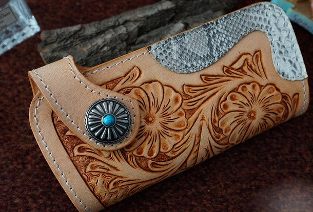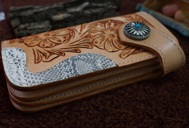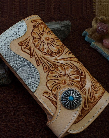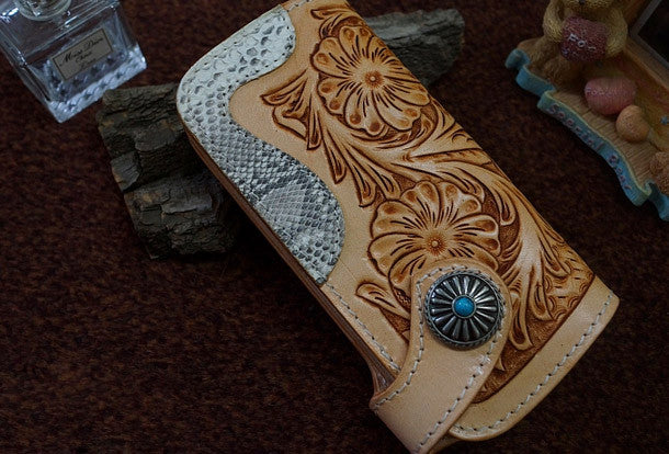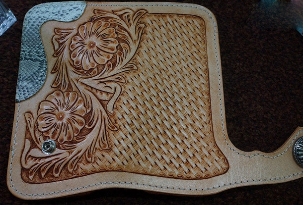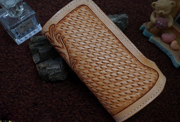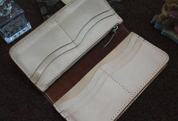 This is handmade natural Italian Vegetable Tanned leather long floral carved biker wallet purse clutch for men.The wallet is bifold,color is beige.There are 3?full size bill slots/holders, 10?ID/credit card slots/holders, 1 zip coin slot/holder~Hand-made in the traditional method with punched holes and saddle stitching by hand.