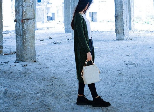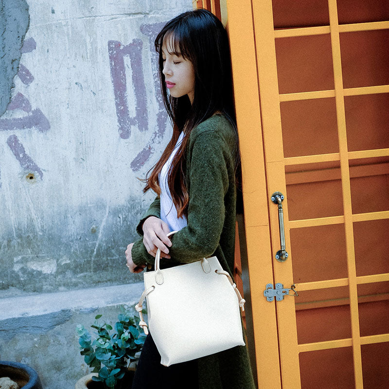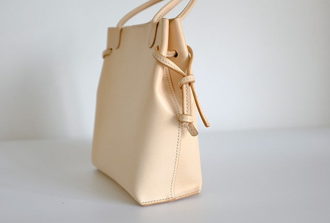 Style: Handmade Leather Beige Womens Handbag Bucket Purse Barrel Bag for Women