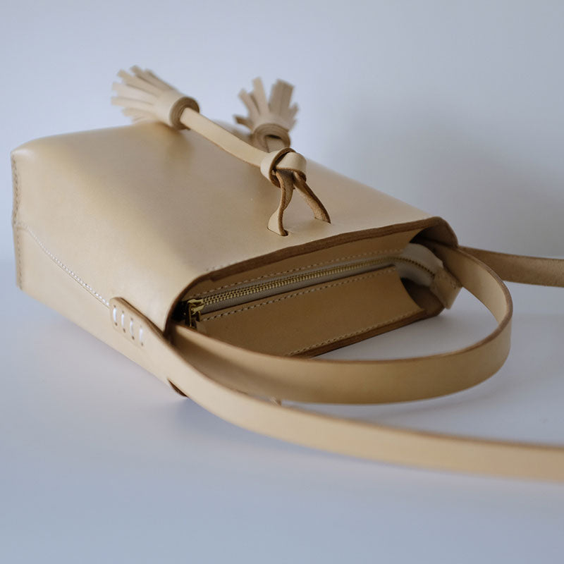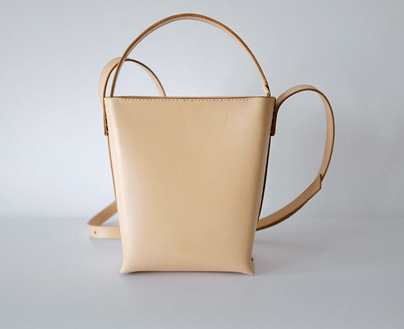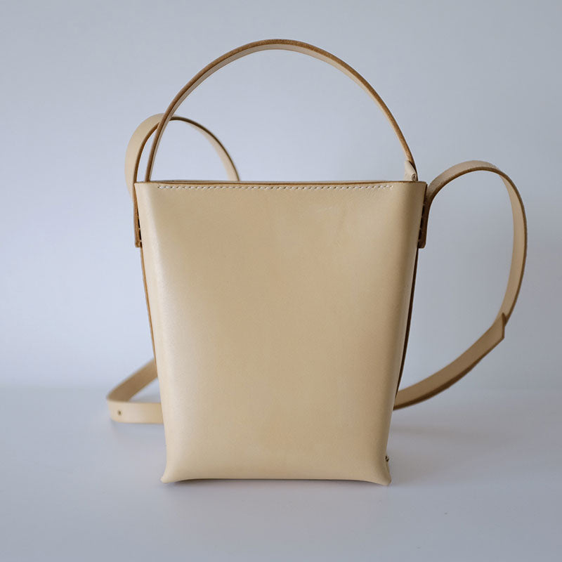 Design: Handmade Leather Beige Womens Bucket Purse Barrel Shoulder Bag for Women