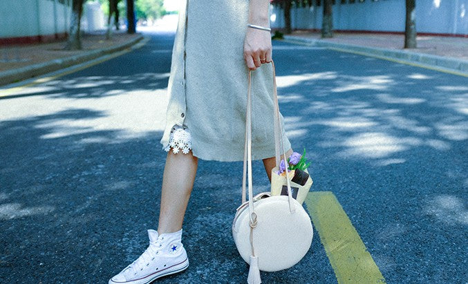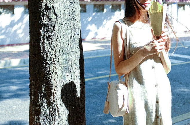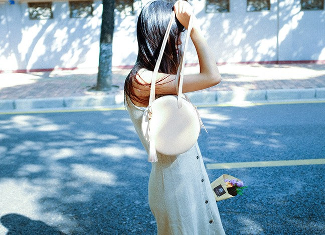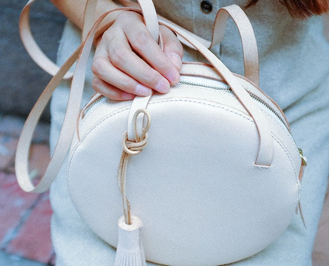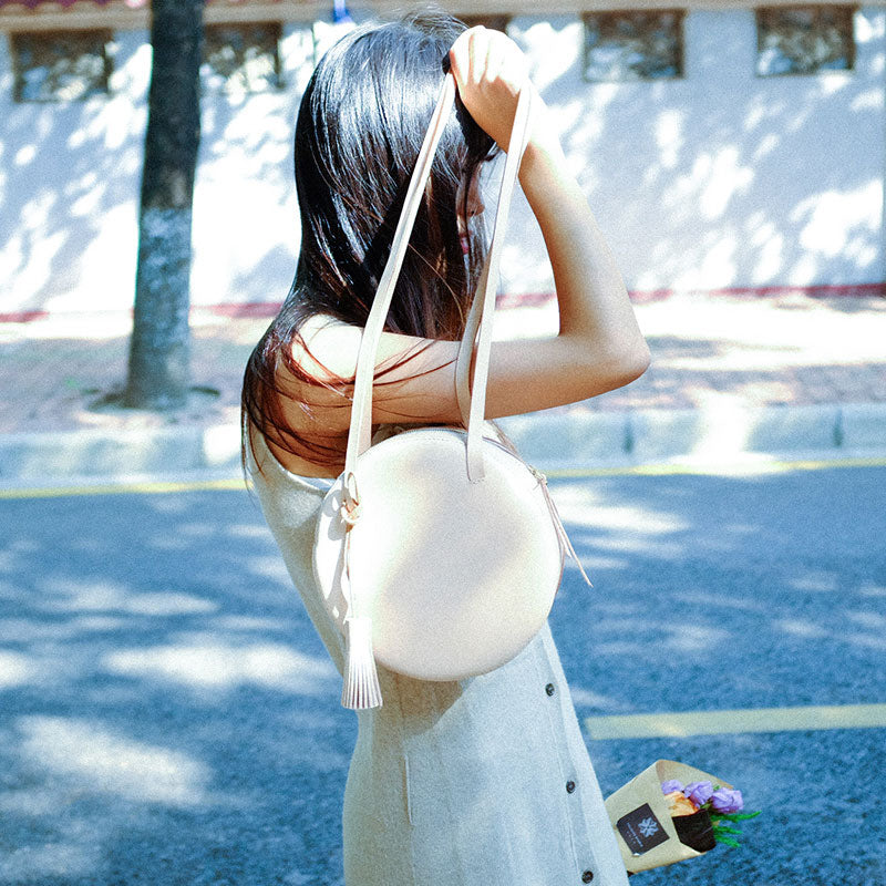Style: Handmade Leather Beige Womens Small Round Shoulder Bag Circle for Women