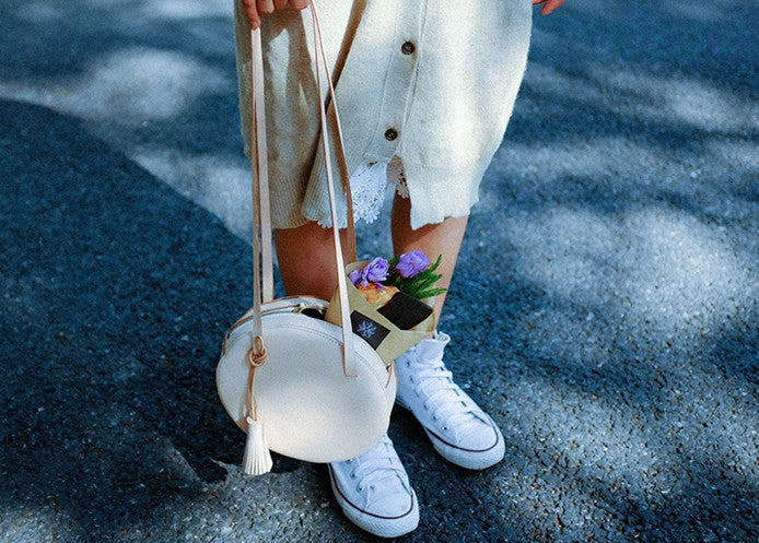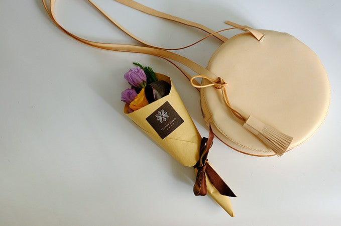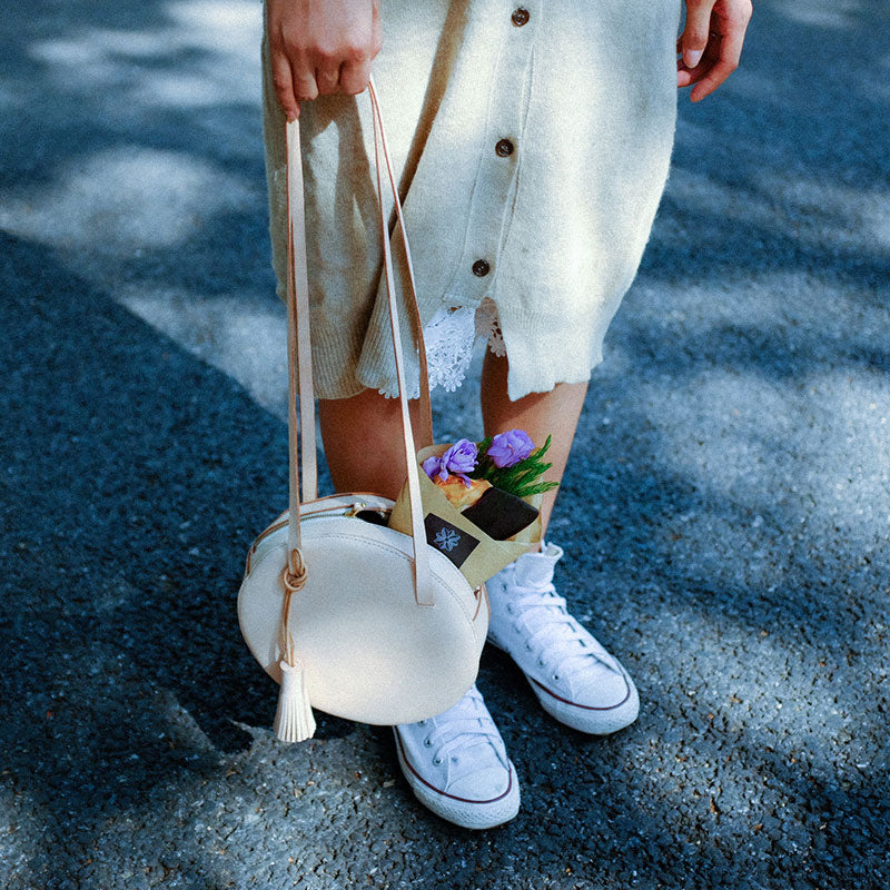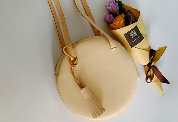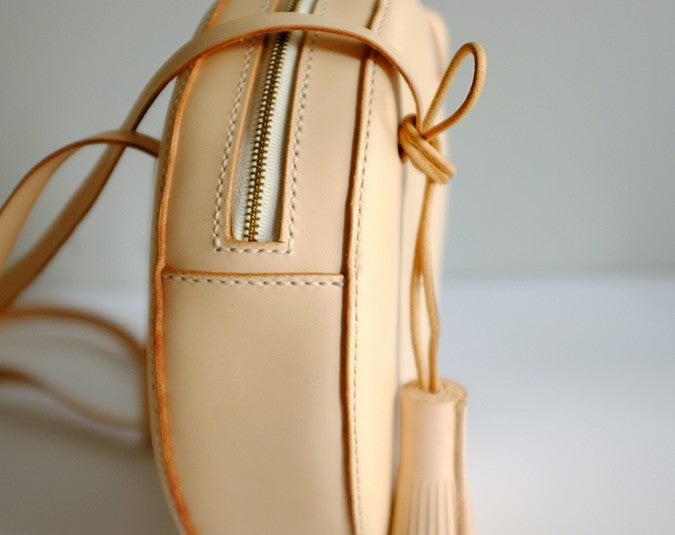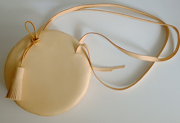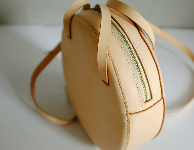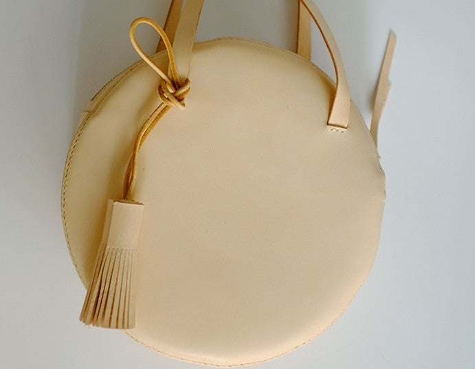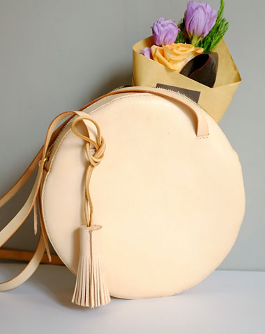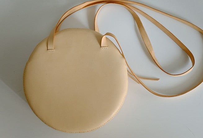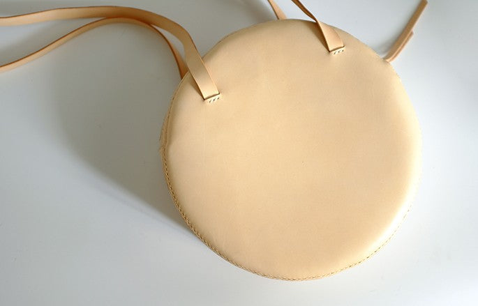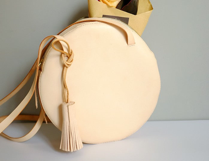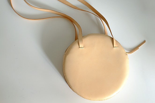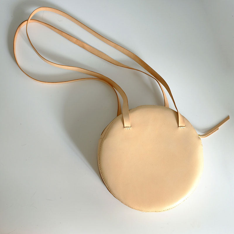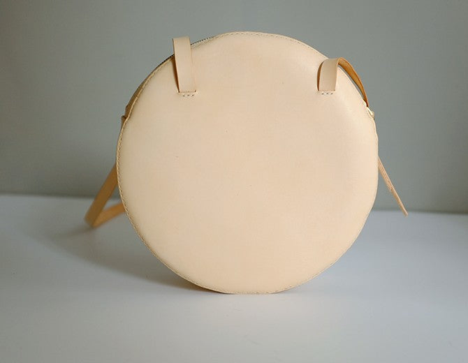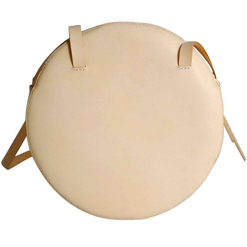 Design: Handmade Leather Beige Womens Small Round Shoulder Bag Circle for Women
