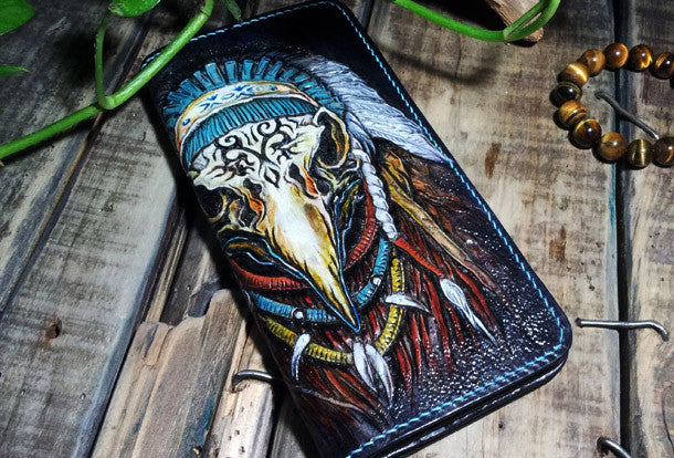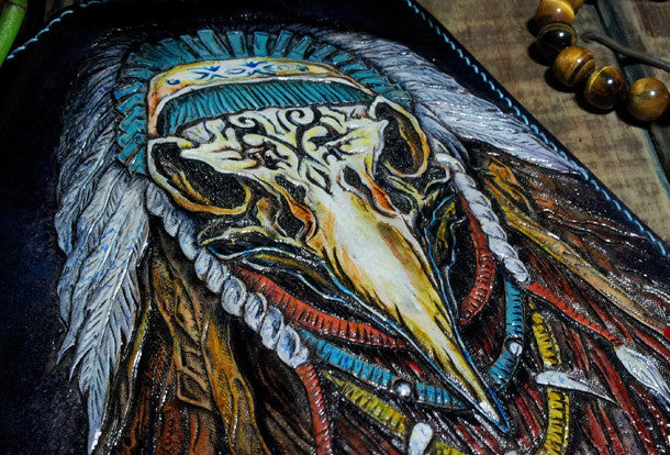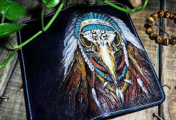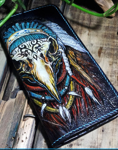 Design: Black Carved Tooled Indian Eagle Leather Wallet