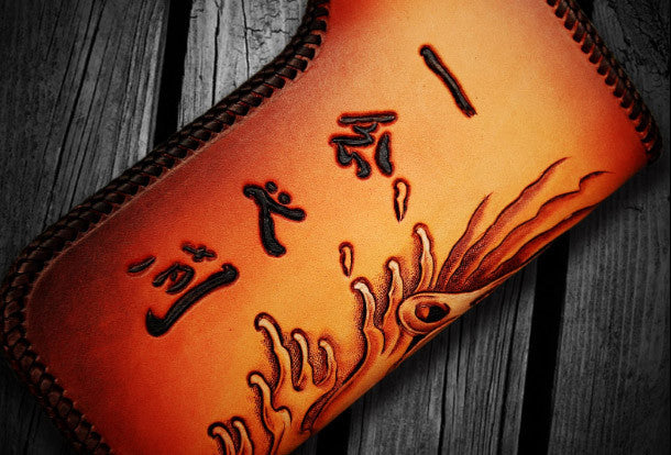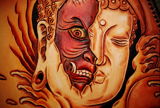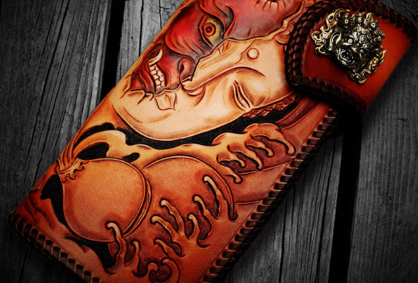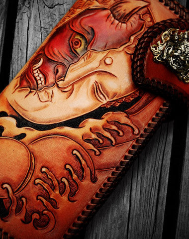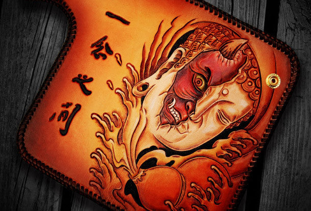 Design: Black?Carved Tooled Buddha Biker Leather Wallet