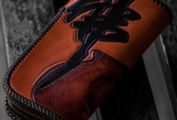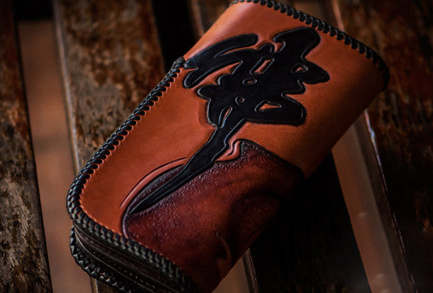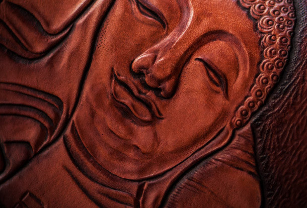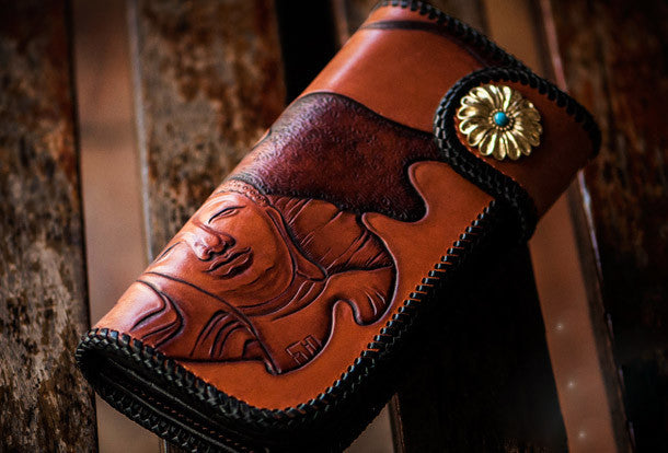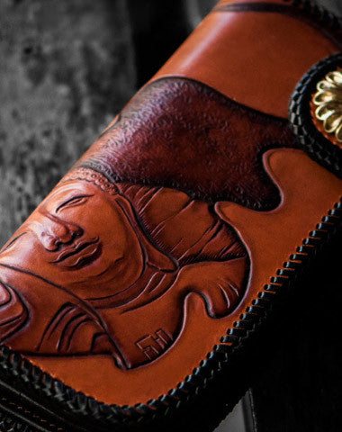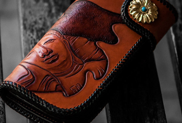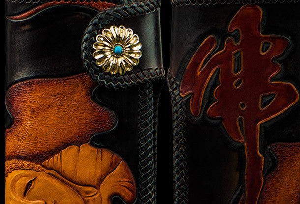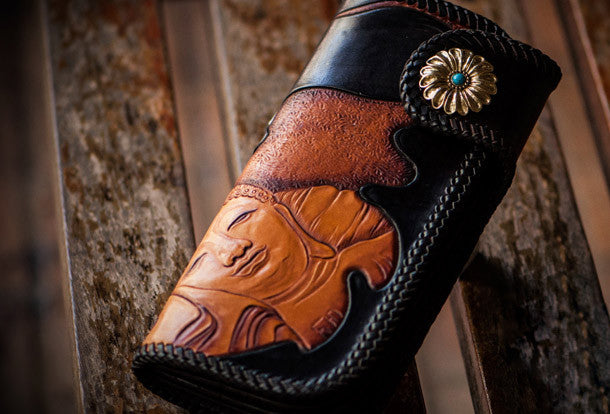 Design: Black Carved Tooled Buddha Biker Leather Wallet