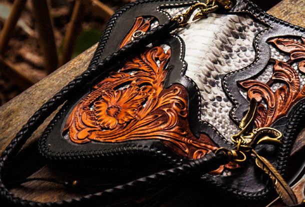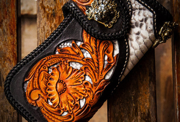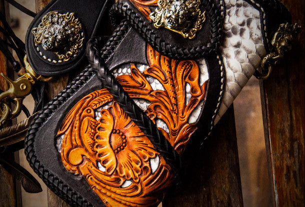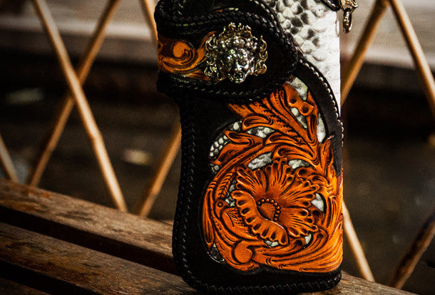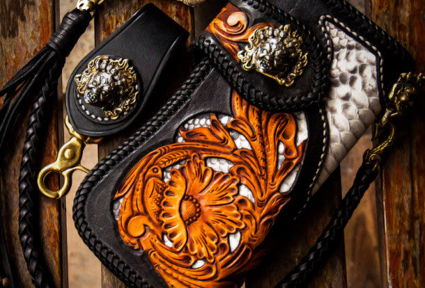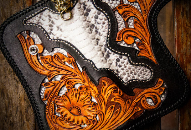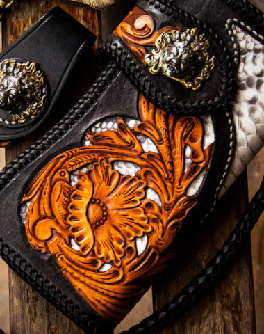 Design: Black?Carved Tooled Floral Biker Leather Wallet