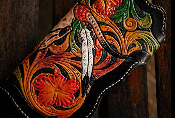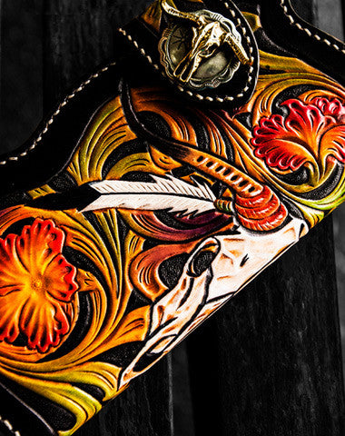 Handmade leather biker trucker wallet black skull floral leather chain men Carved Tooled wallet