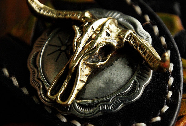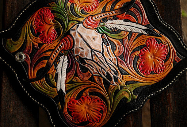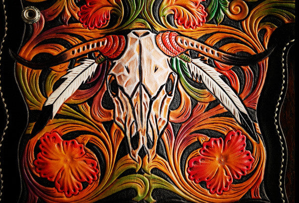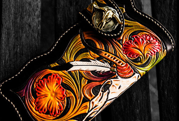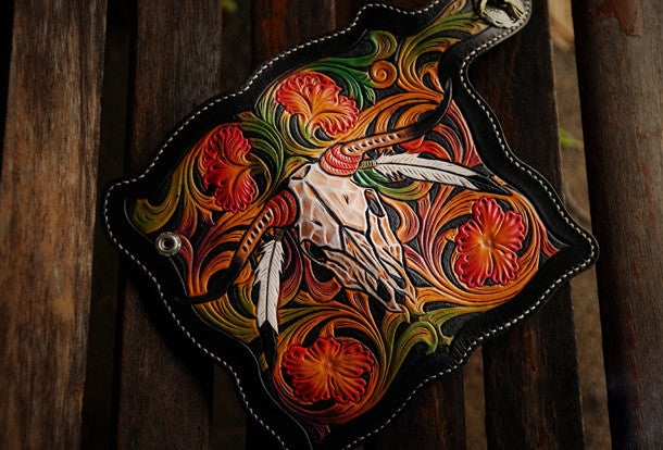 Design: Black?Carved Tooled Floral Skull Biker Leather Wallet