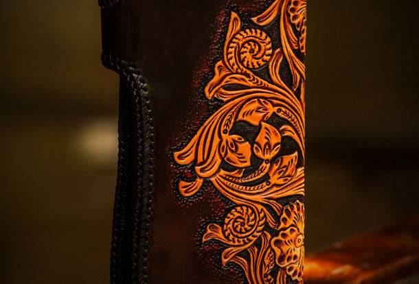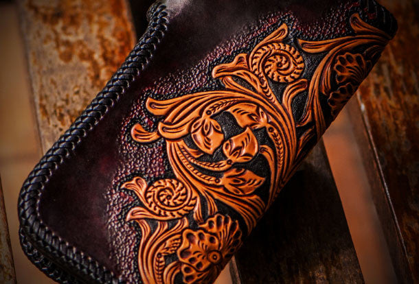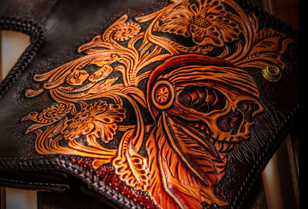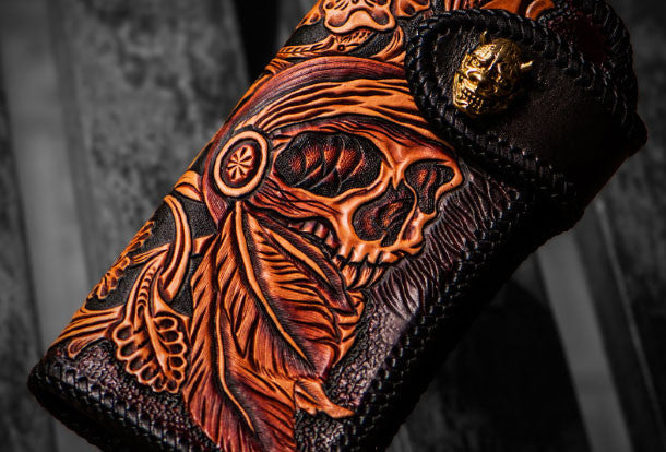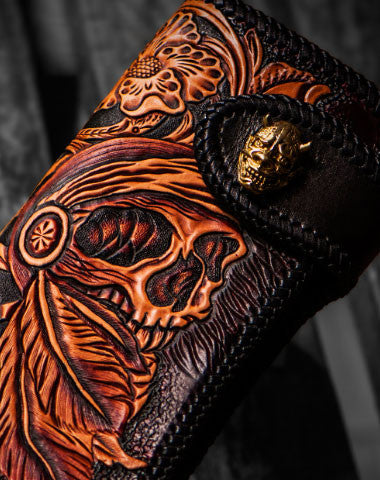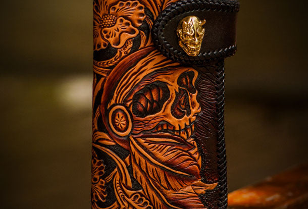 Design: Black?Carved Tooled Skull Biker Leather Wallet