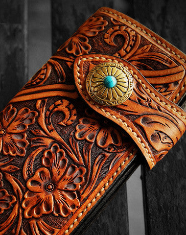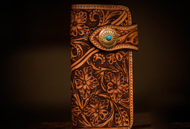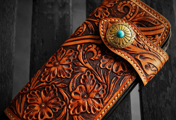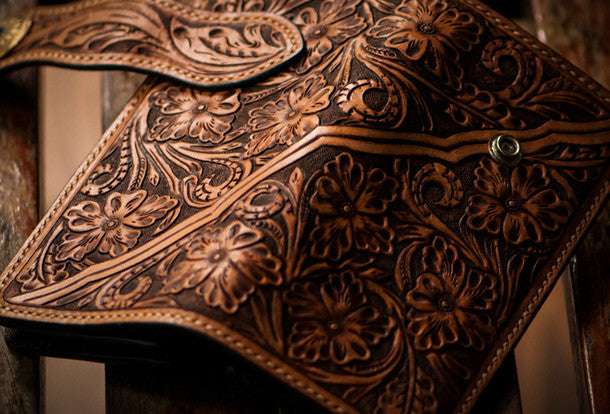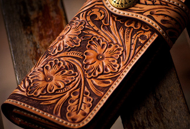 Design: Brown?Carved Tooled Floral Biker Leather Wallet