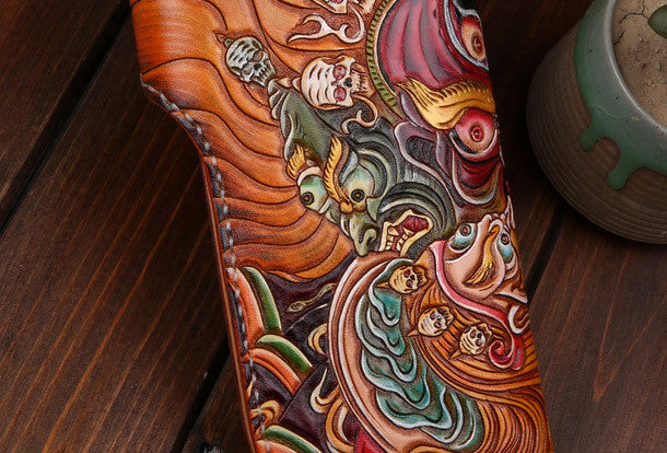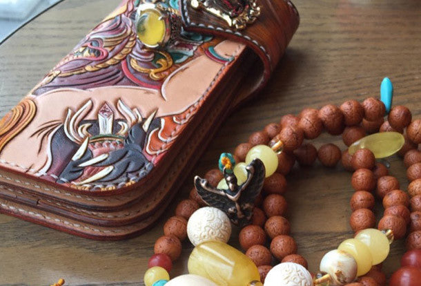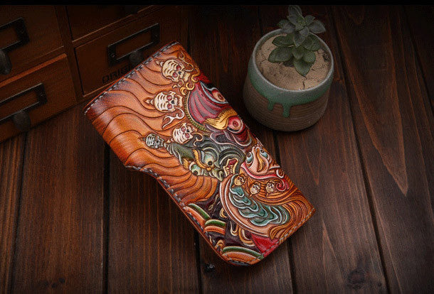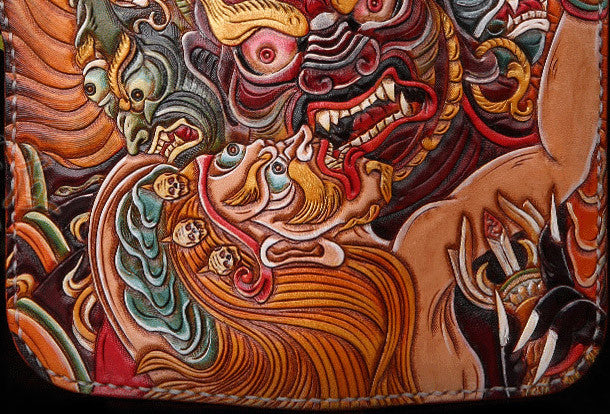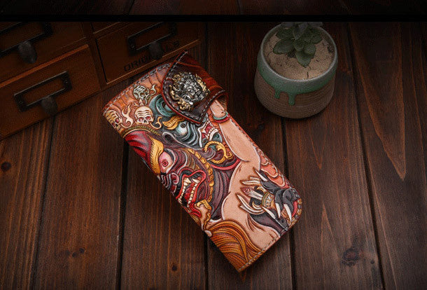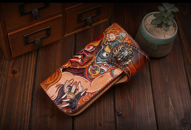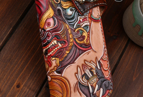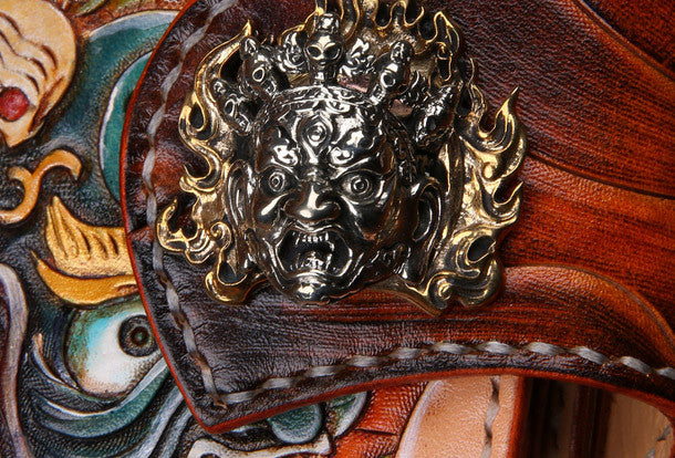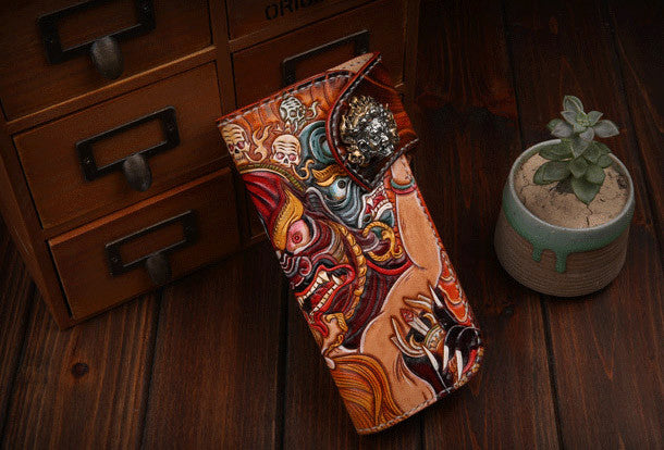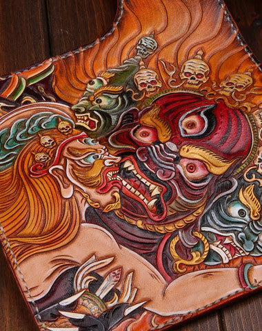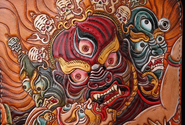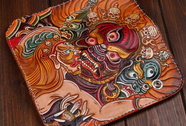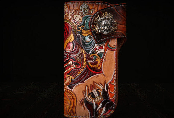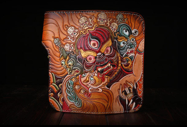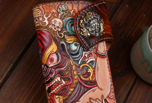 Design: Brown Carved Tooled Biker Leather Wallet?God Mahakala