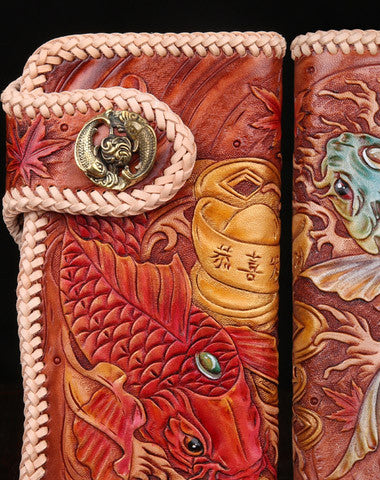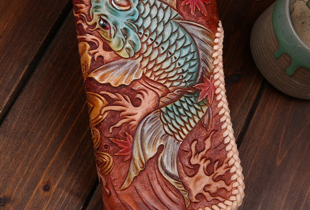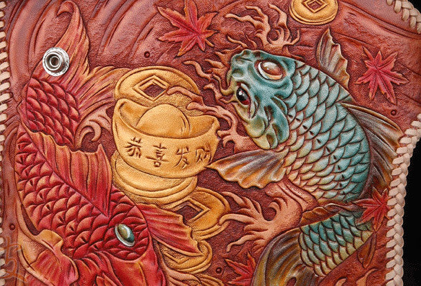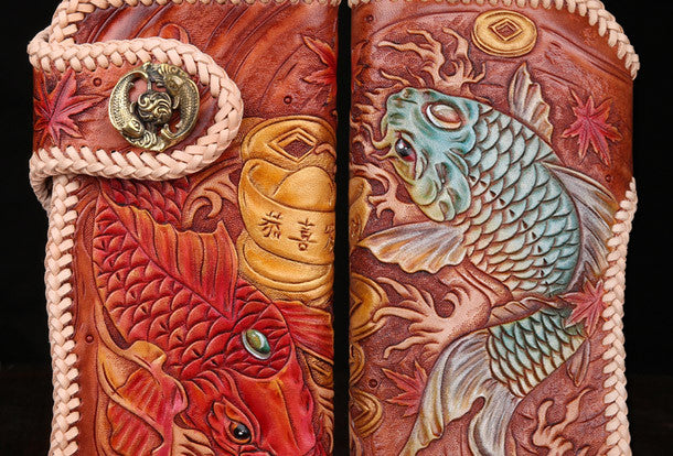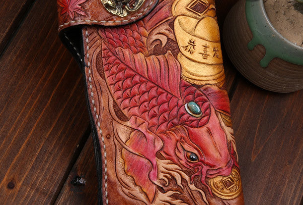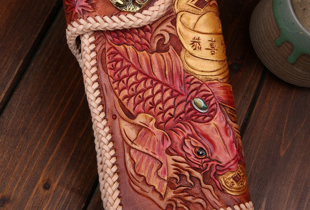 Design: Brown Carp Carved Tooled Biker Leather Wallet