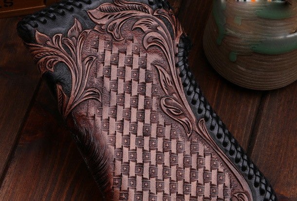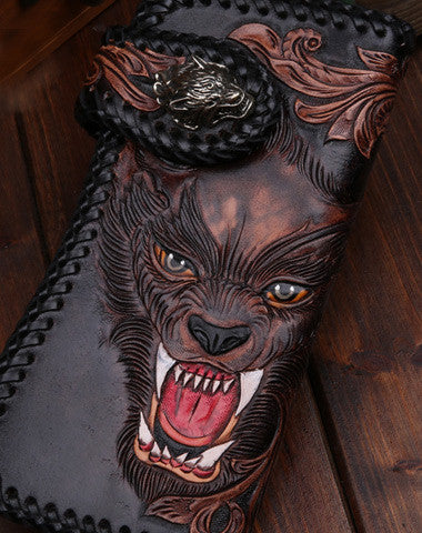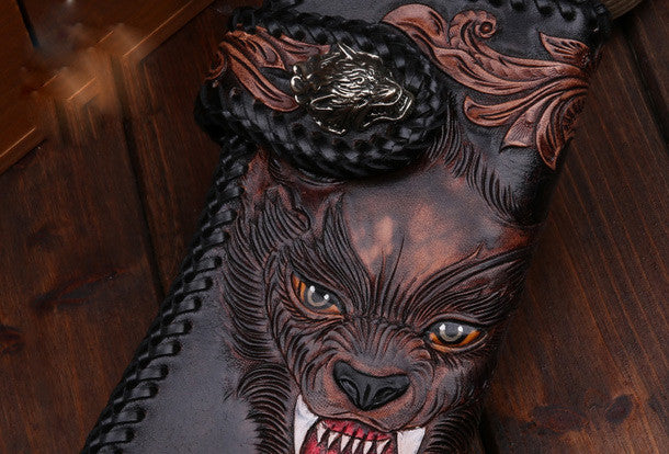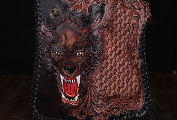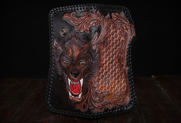 Design: Black Carved Tooled Wolf Biker Leather Wallet