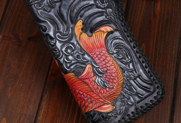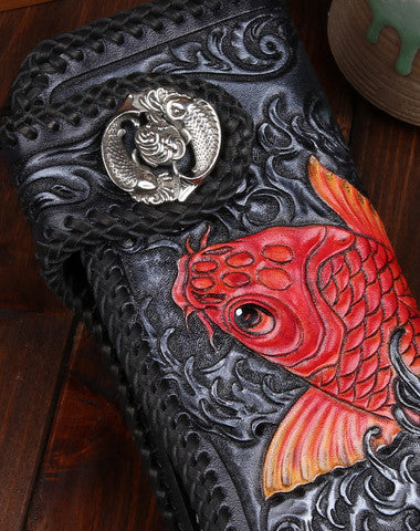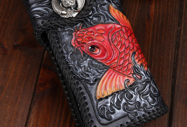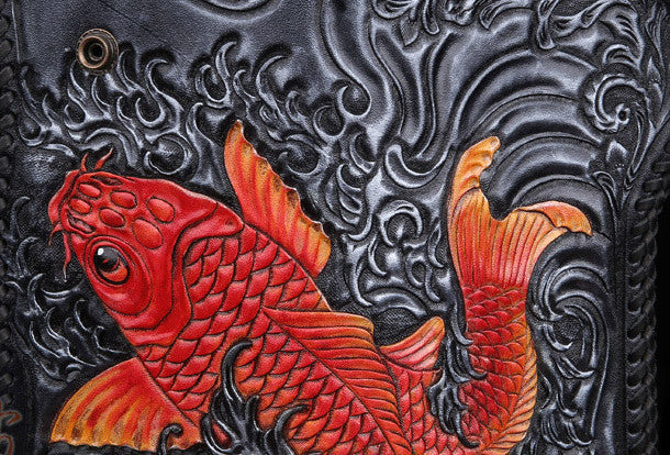 Design: Black Red Carp Carved Tooled Biker Leather Wallet