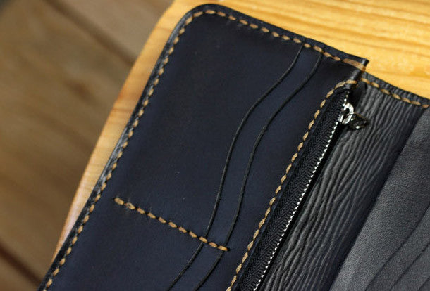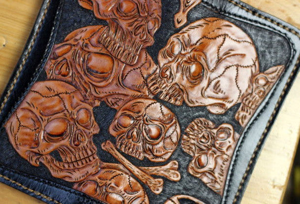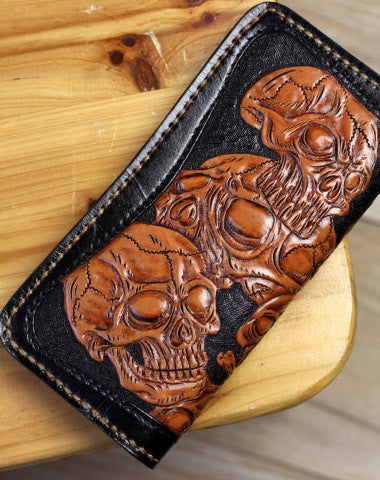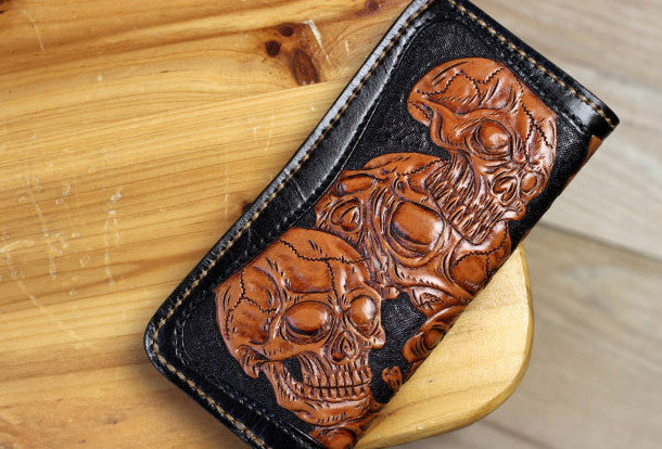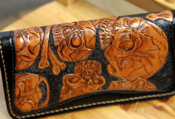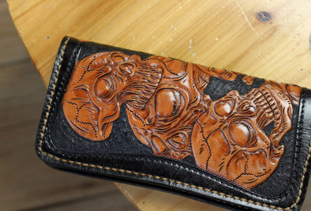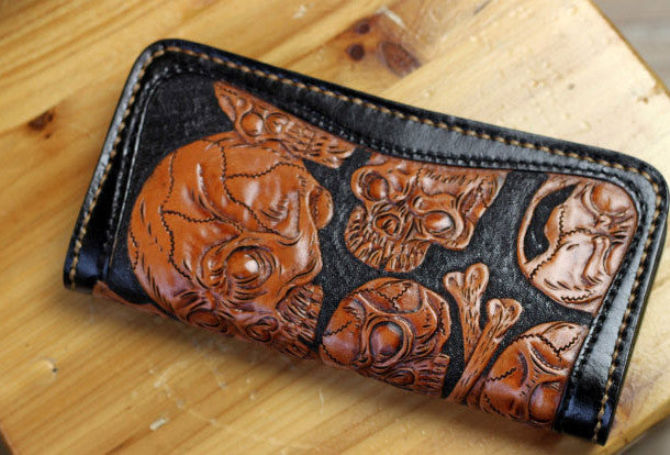 This is handmade natural leather?long?black?brown?skull punk?carved biker wallet purse clutch for men.The wallet is bifold,color is black&brown?.There are 3?full size bill slots/holders, 10?ID/credit card slots/holders, 1 zip coin slot/holder~Hand-made in the traditional method with punched holes and saddle stitching by hand.