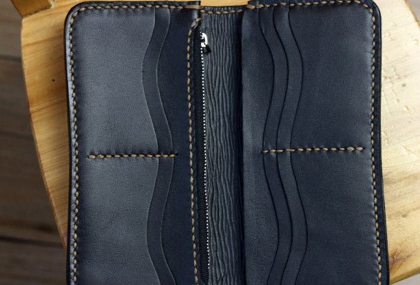 This is handmade natural leather?long?black?brown?skull punk?carved biker wallet purse clutch for men.The wallet is bifold,color is black&brown?.There are 3?full size bill slots/holders, 10?ID/credit card slots/holders, 1 zip coin slot/holder~Hand-made in the traditional method with punched holes