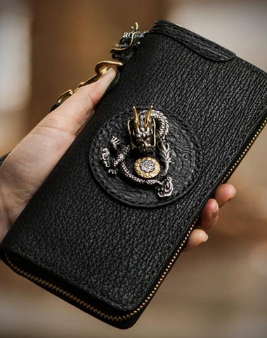 Design: Handmade Leather Black Sharkskin Chain Wallet Mens Biker Wallet Cool Leather Wallet Long Phone Wallets for Men
