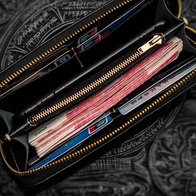 Slots: 2 full size bill slot, 8 card holders, 1 zipper slot