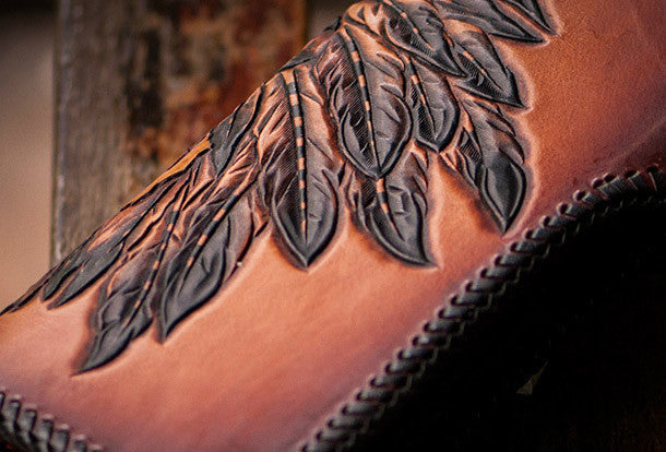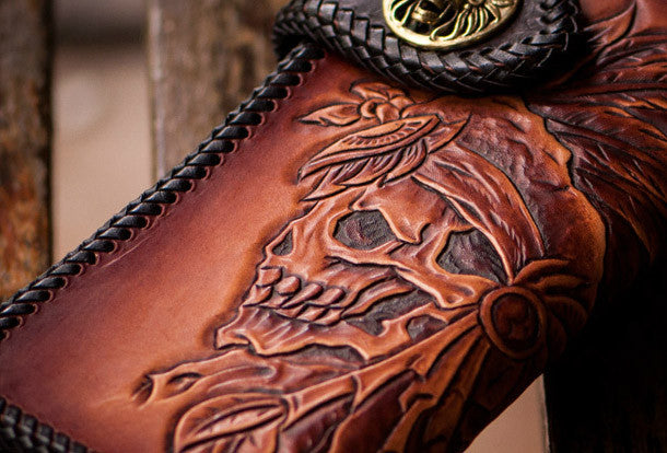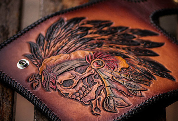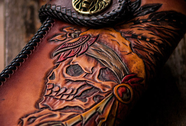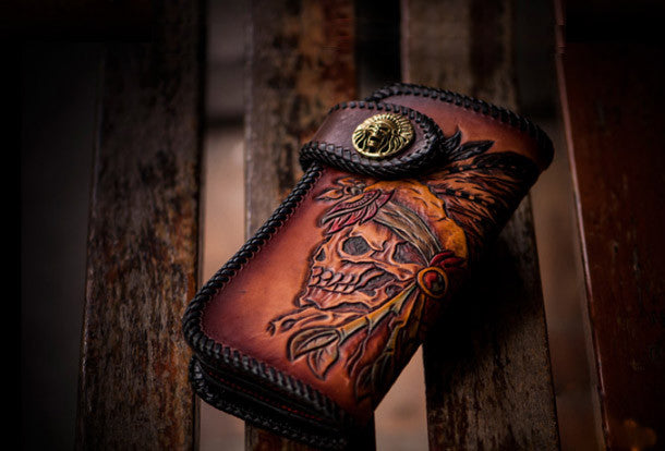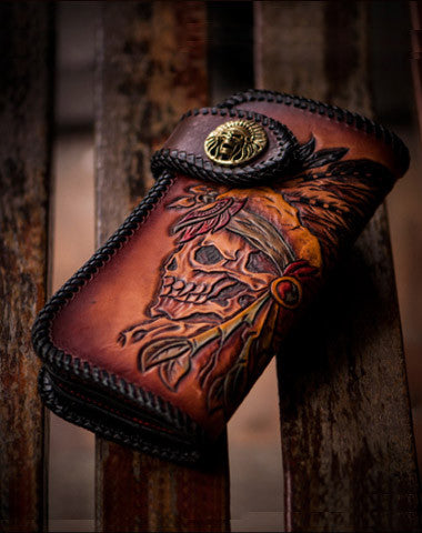 This is handmade brown?natural Italian Vegetable Tanned leather?long?indian skull carved biker wallet purse clutch for men.The wallet is bifold,color is brown.There are 1?full size bill slots/holders, 8?ID/credit card slots/holders,1 coin change slot~Hand-made in the traditional method with punched holes and saddle stitching by hand.