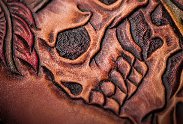 This is handmade brown?natural Italian Vegetable Tanned leather?long?indian skull carved biker wallet purse clutch for men.The wallet is bifold,color is