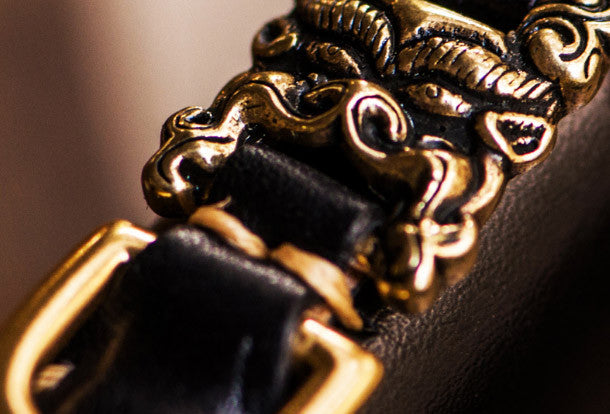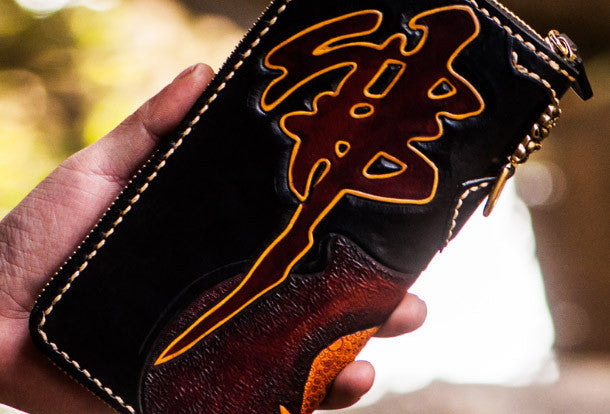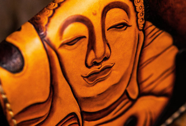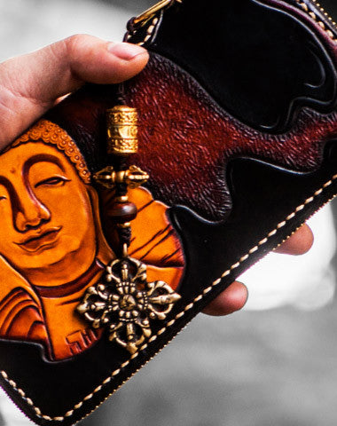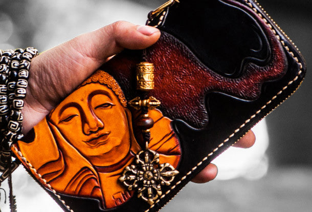 Design: Brown Carved Tooled Buddha?biker Clutch zip Leather Wallet