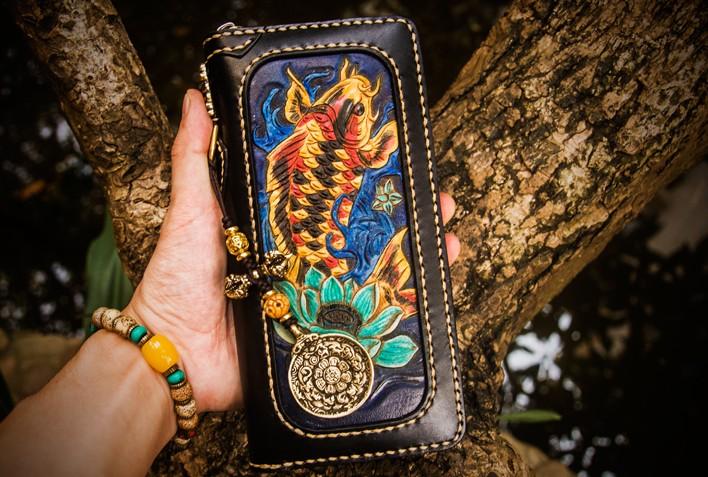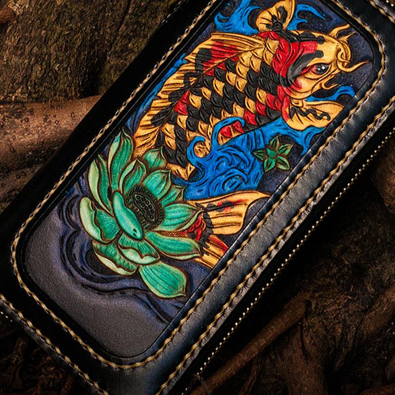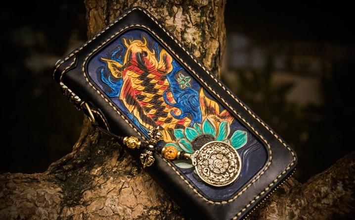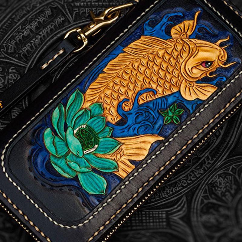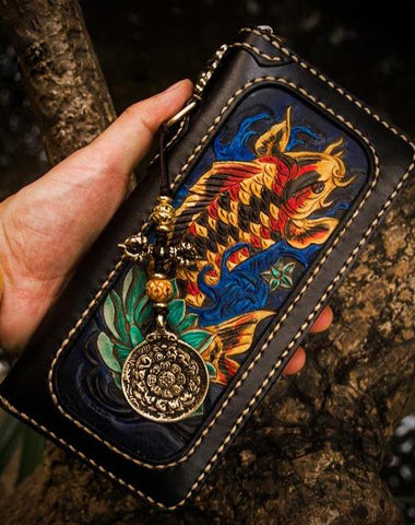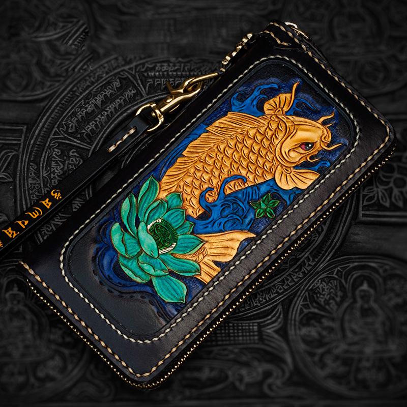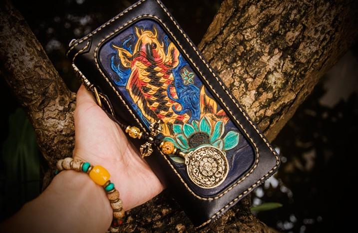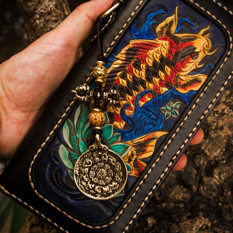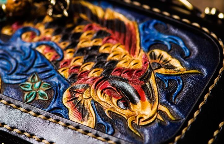 Design: Handmade Leather Carp Mens Chain Biker Wallet Cool Leather Wallet Long Phone Wallets for Men