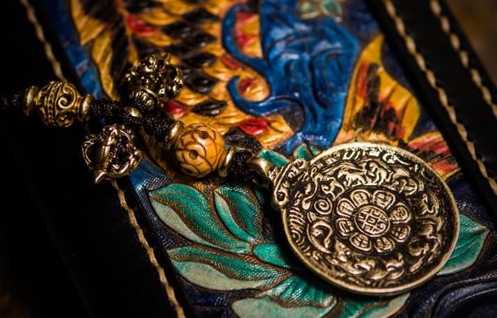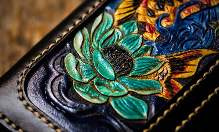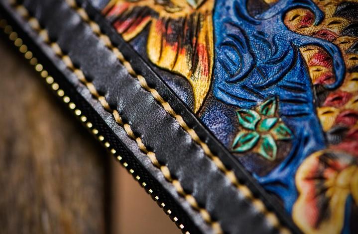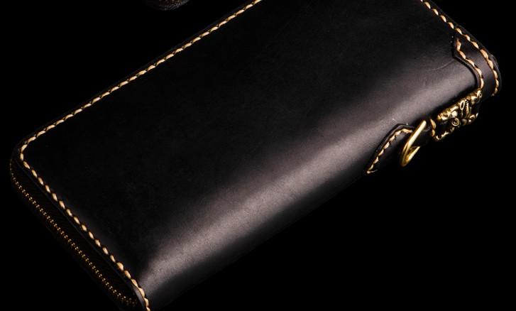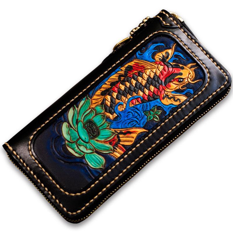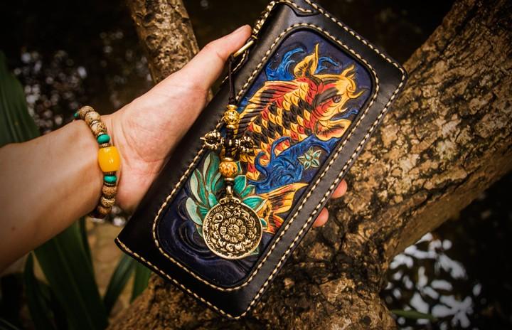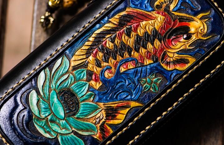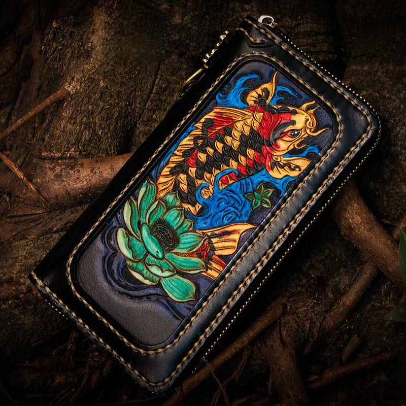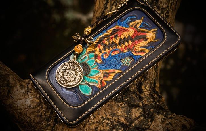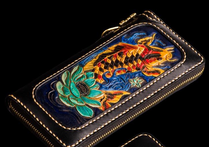 Design: Handmade Leather Carp Mens Chain Biker Wallet Cool Leather Wallet Long Phone Wallets for Men