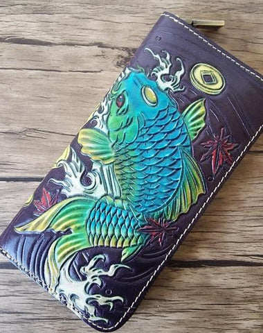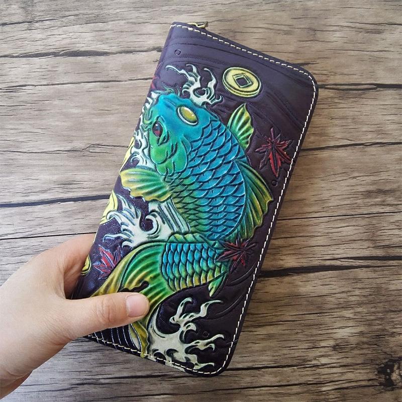 Style: Handmade Leather Carp Tooled Mens Long Wallet Cool Leather Wallet Clutch Wallet for Men