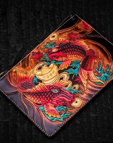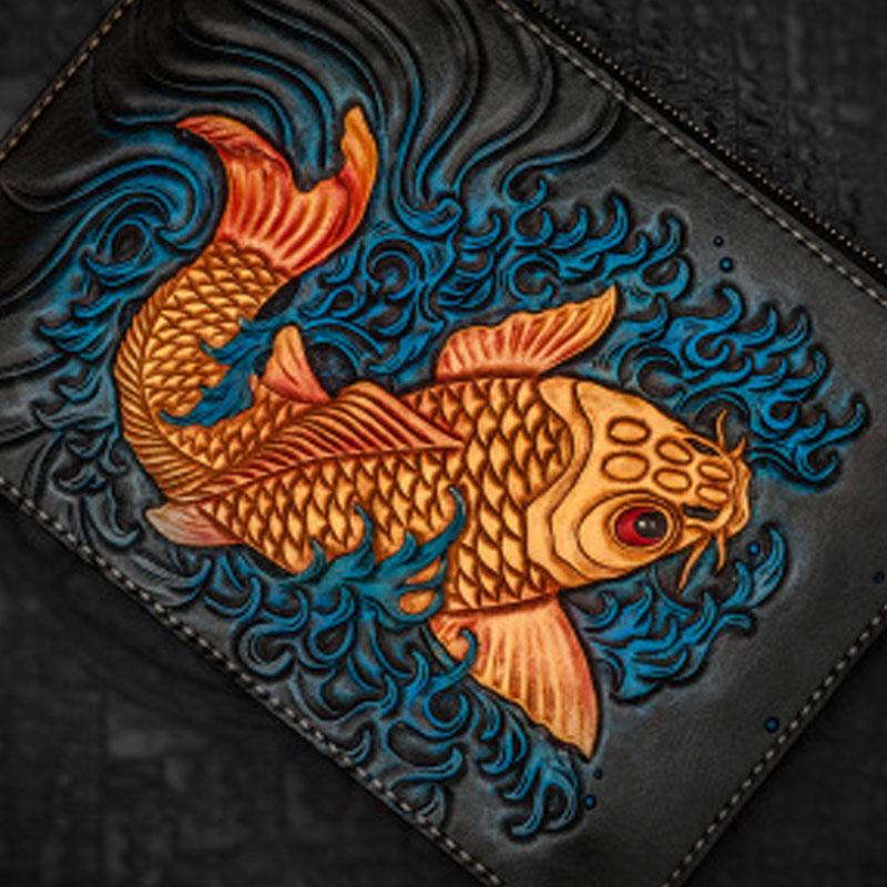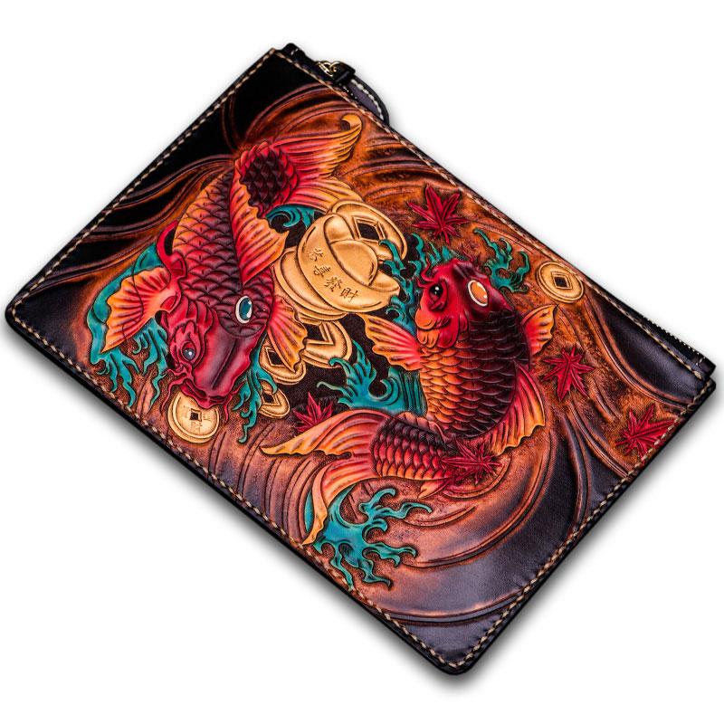 Style: Handmade Leather Carp Tooled Wristlet Bag iPad Bag Mens Cool Leather Wallet Long Clutch for Men
