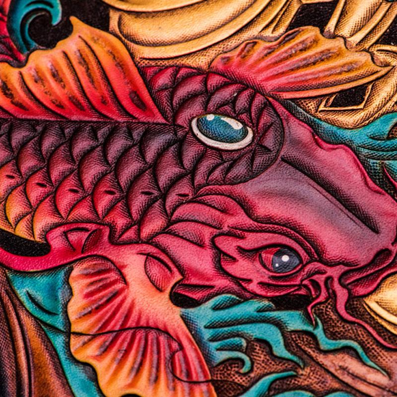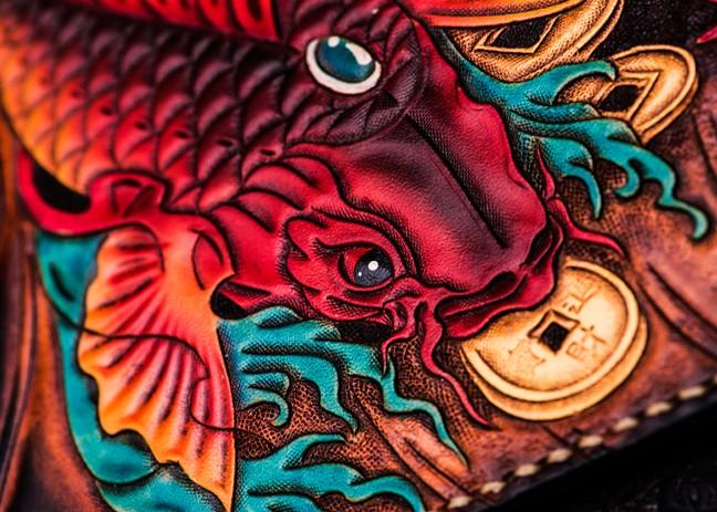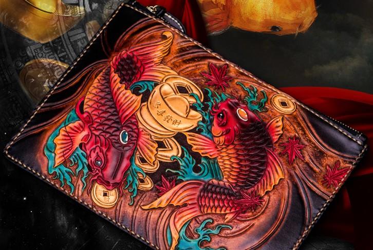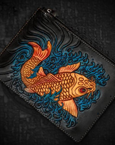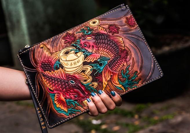 Design: Handmade Leather Carp Tooled Wristlet Bag iPad Bag Mens Cool Leather Wallet Long Clutch for Men