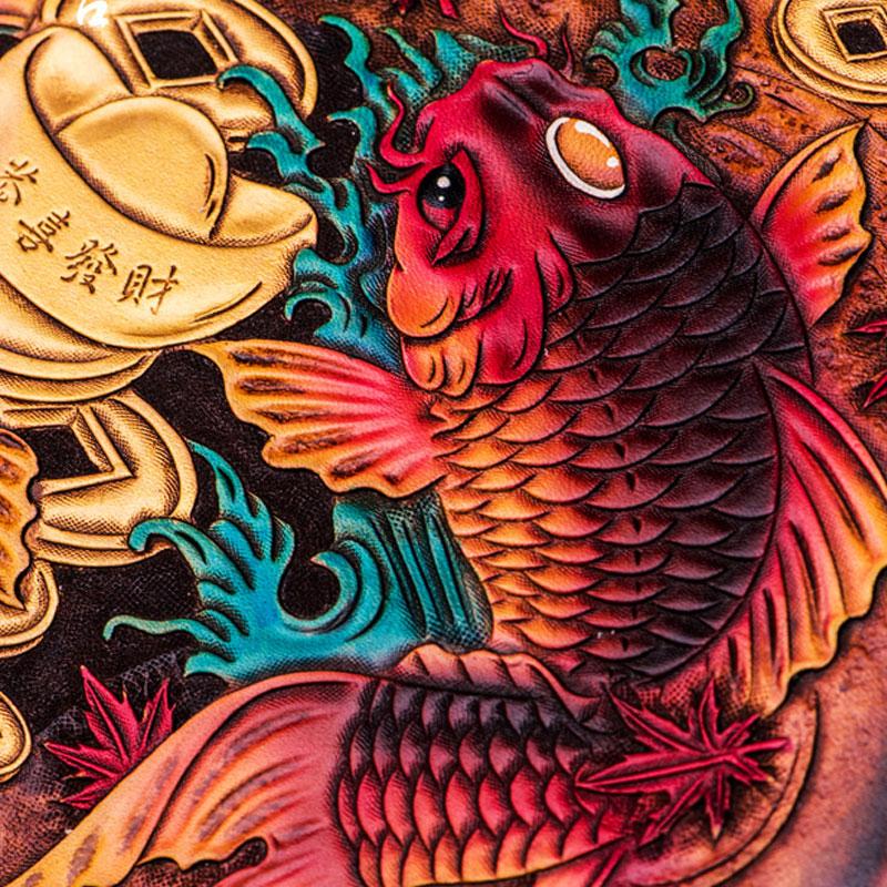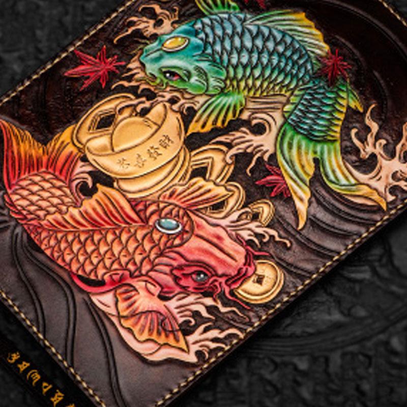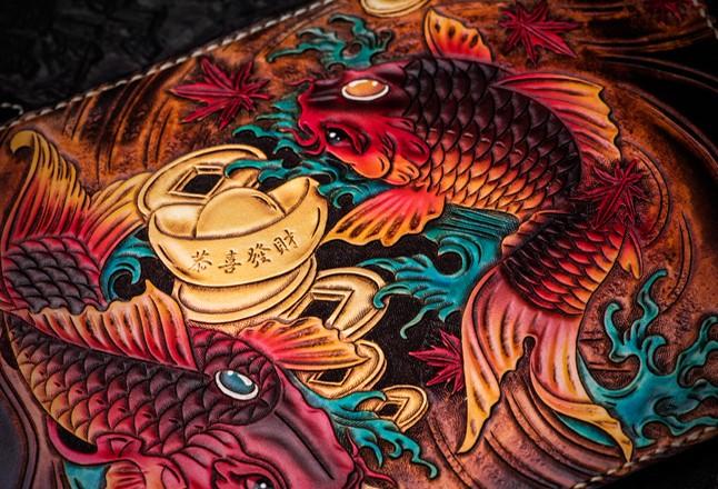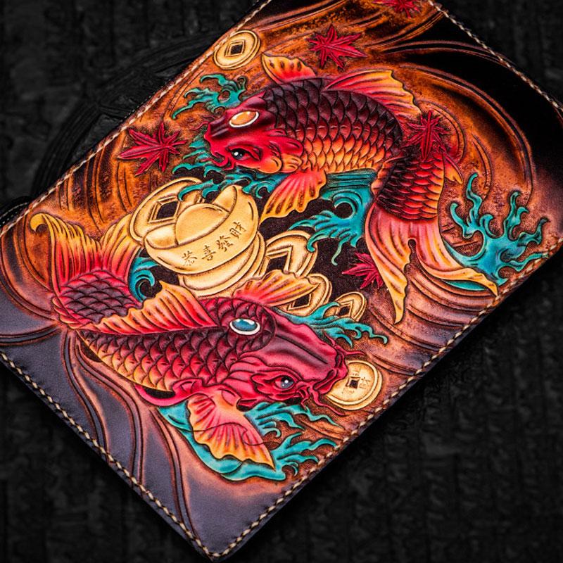 Handmade Leather Carp Tooled Wristlet Bags Mens Cool Leather Wallet Long Clutch for Men