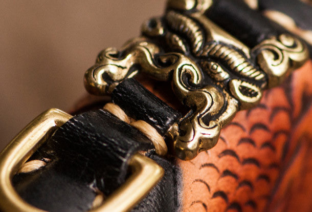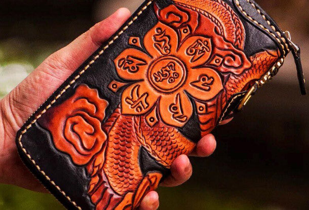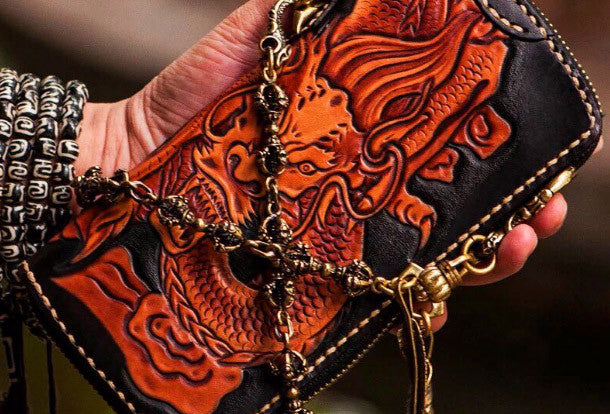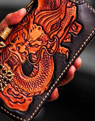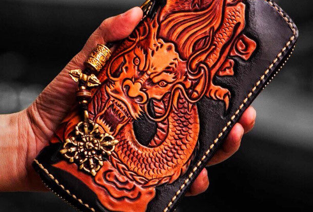Design: Brown?Carved Tooled Chinese Dragon?biker Clutch zip Leather Wallet