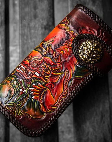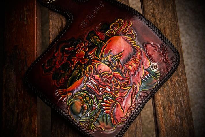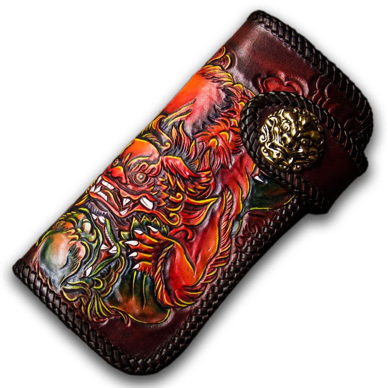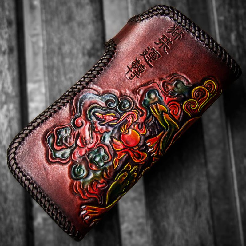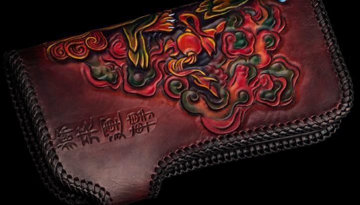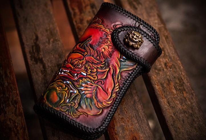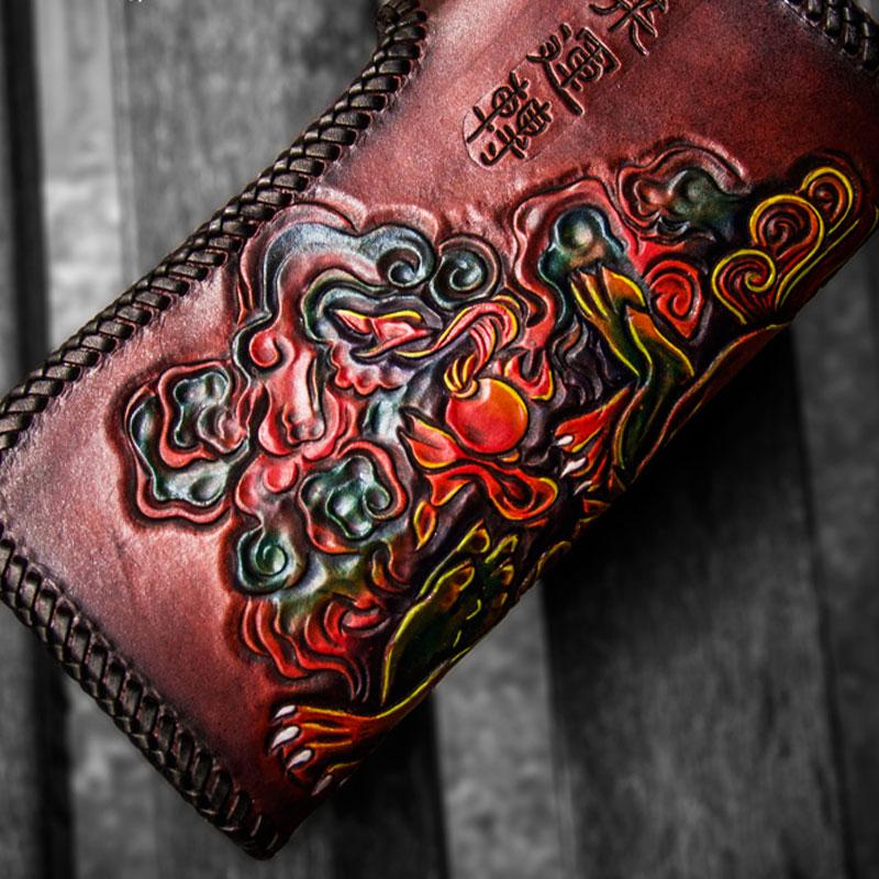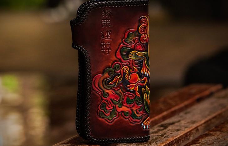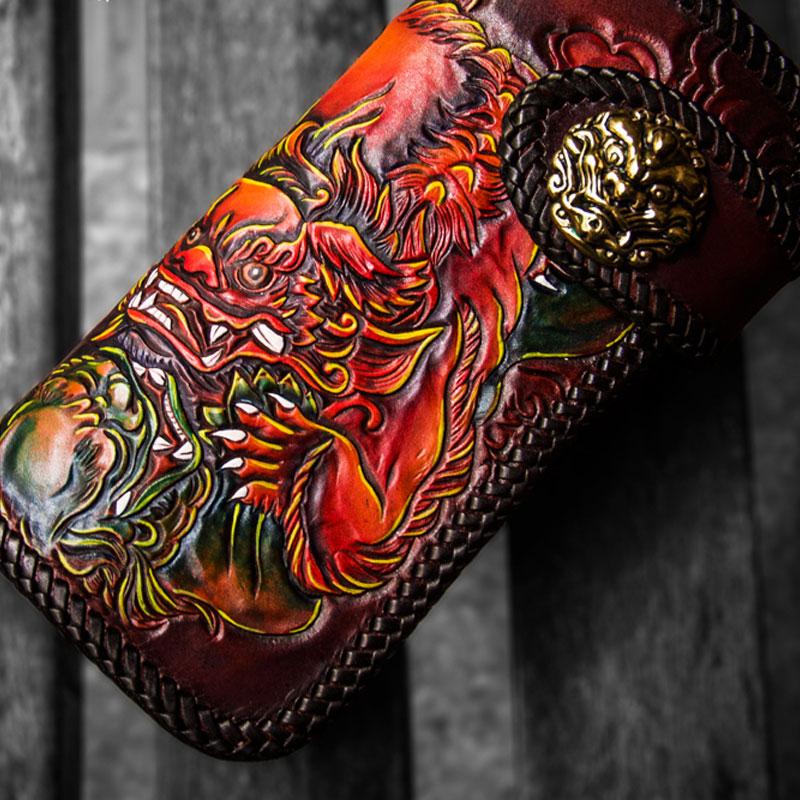 Design: Handmade Leather Chinese Lion Mens Chain Biker Wallet Cool Leather Wallet With Chain Wallets for Men