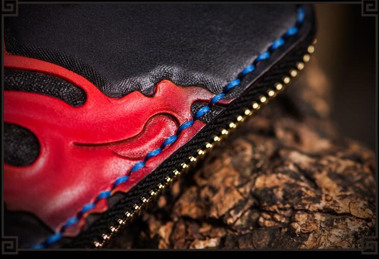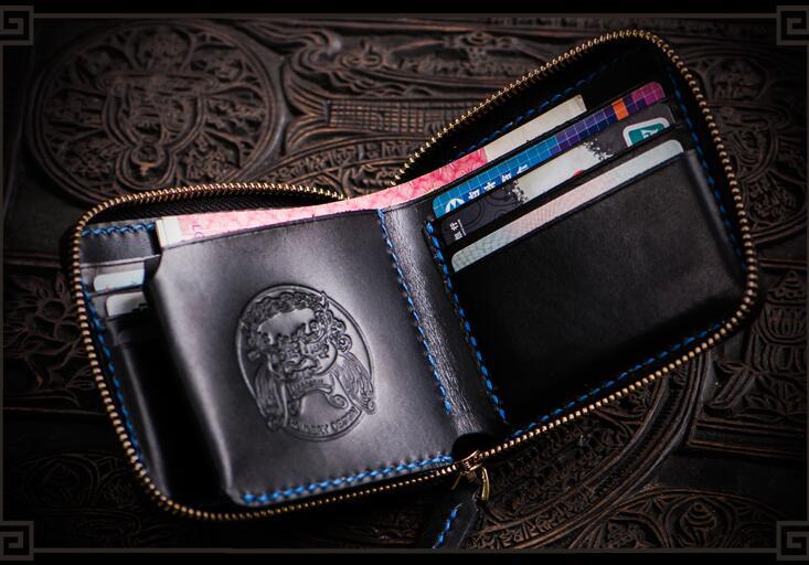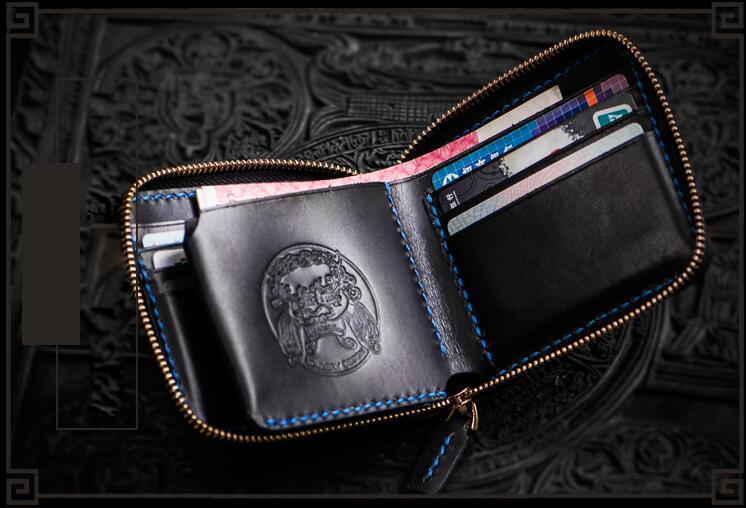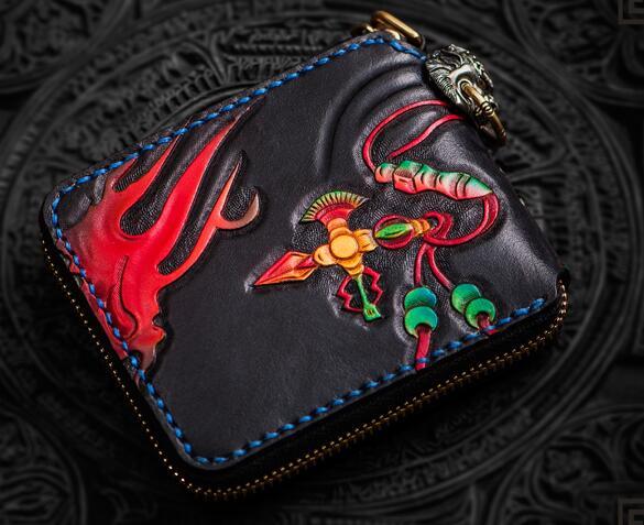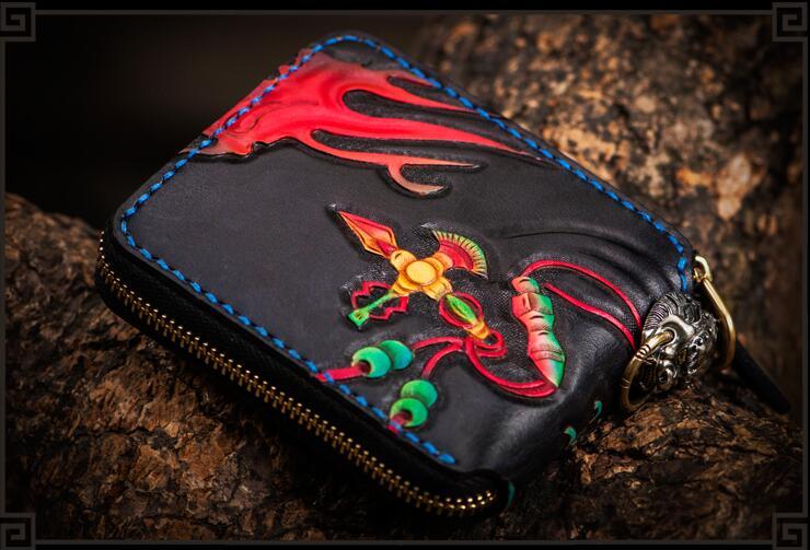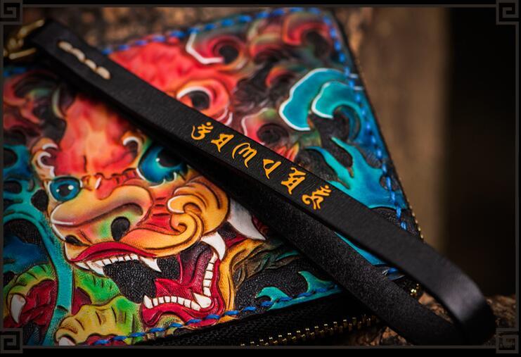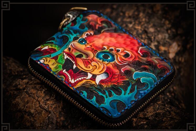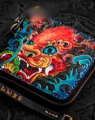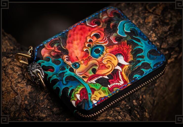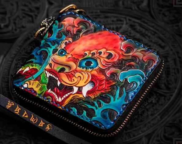 Design: Handmade Leather Chinese Lion Tooled Mens billfold Wallet Cool Chain Wallet Biker Wallet for Men