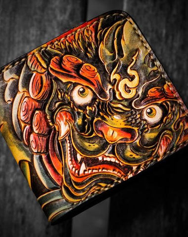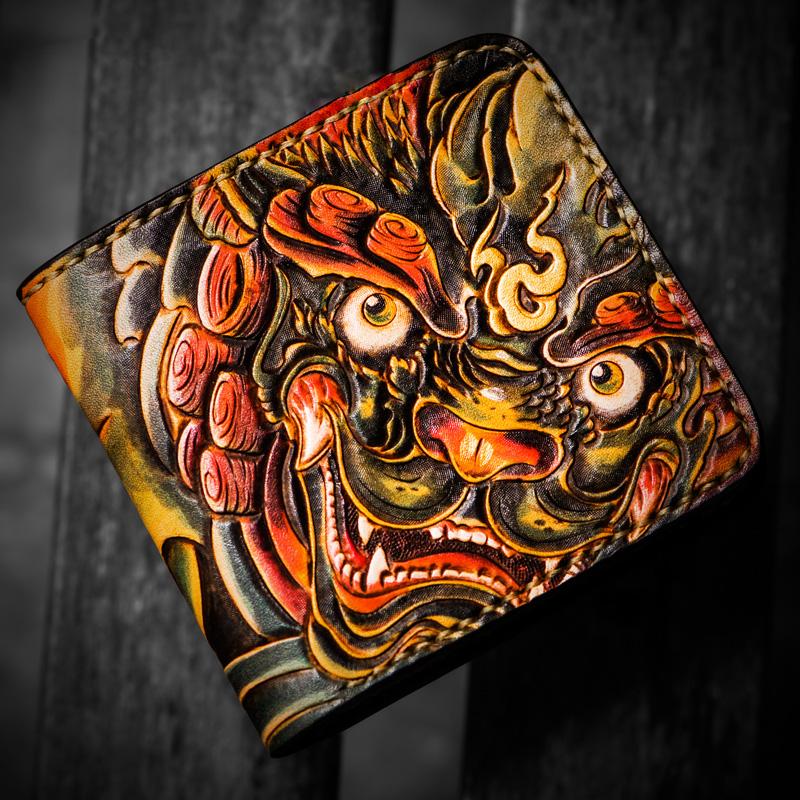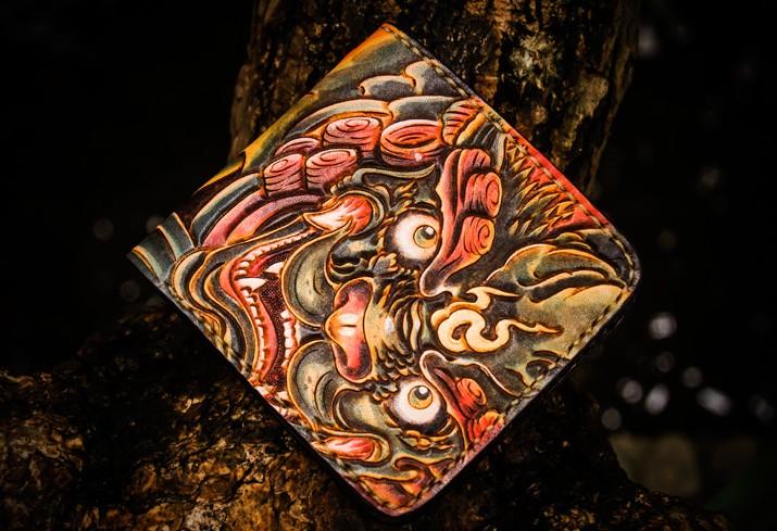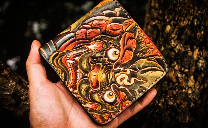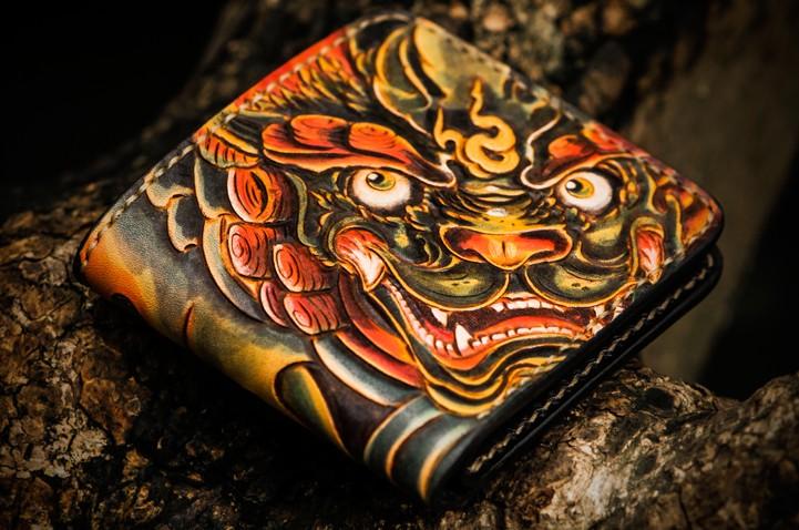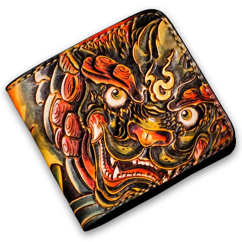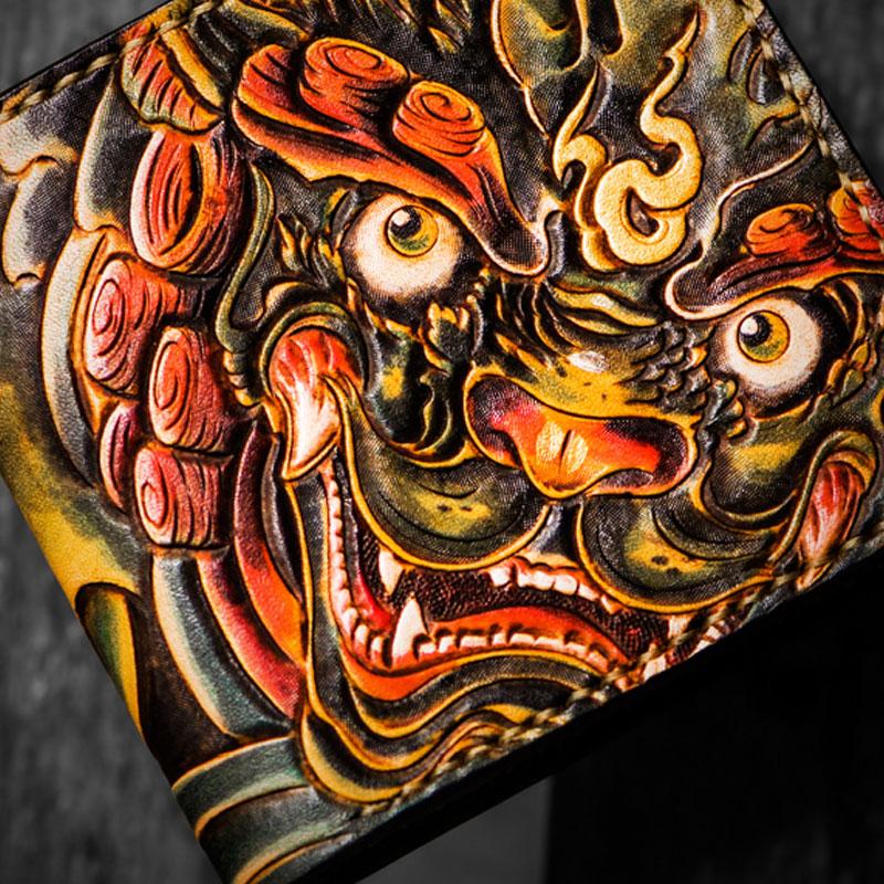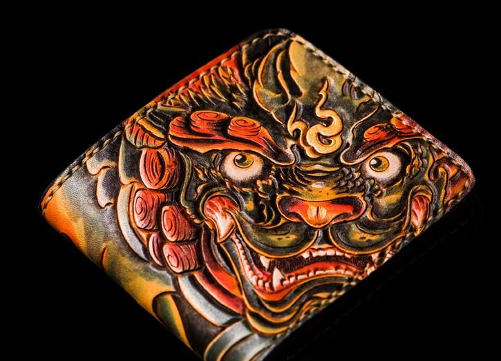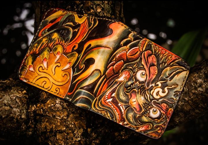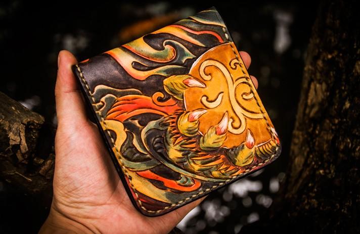Design: Handmade Leather Chinese Lion Tooled Mens billfold Wallet Cool Leather Wallet Slim Wallet for Men