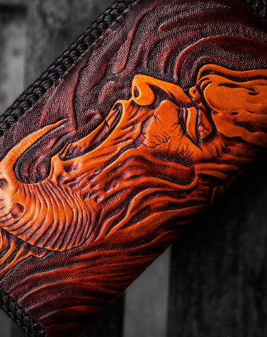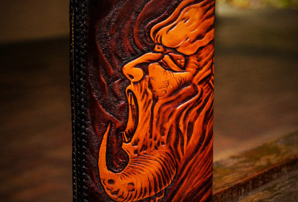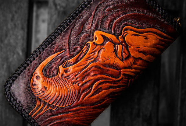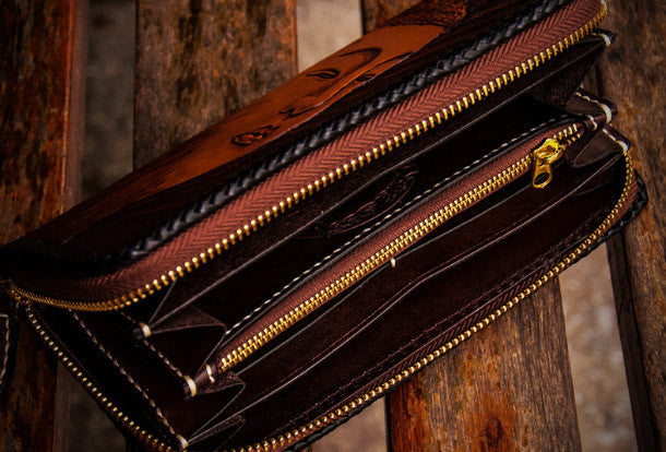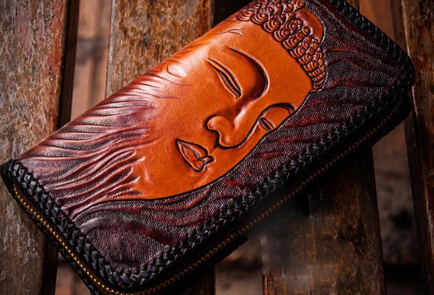 Handmade leather clutch zip long wallet black buddha leather men Tooled